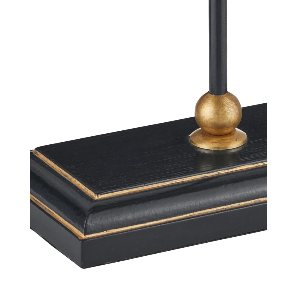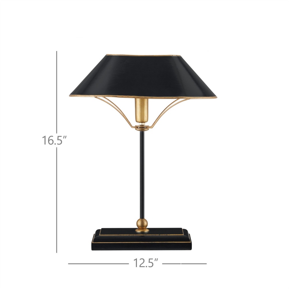 The Daphne Black Table Lamp looks as if it is made of one material in two distinctive finishes, but the base is made of wood while the other elements are made of iron and brass. The shape of the oval shade with its painted gold trim is a sophisticated design detail, as is the gold finish on the interior of the shade that will warm the light bouncing off it.
