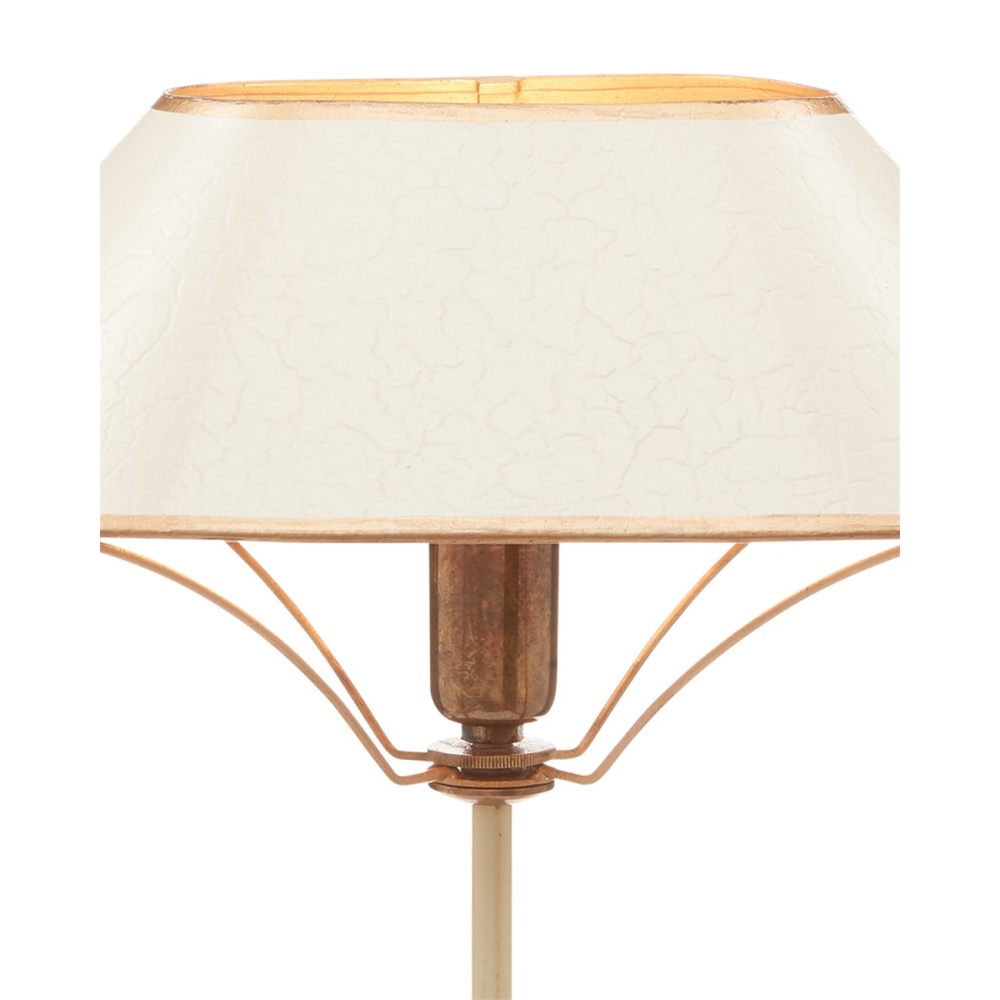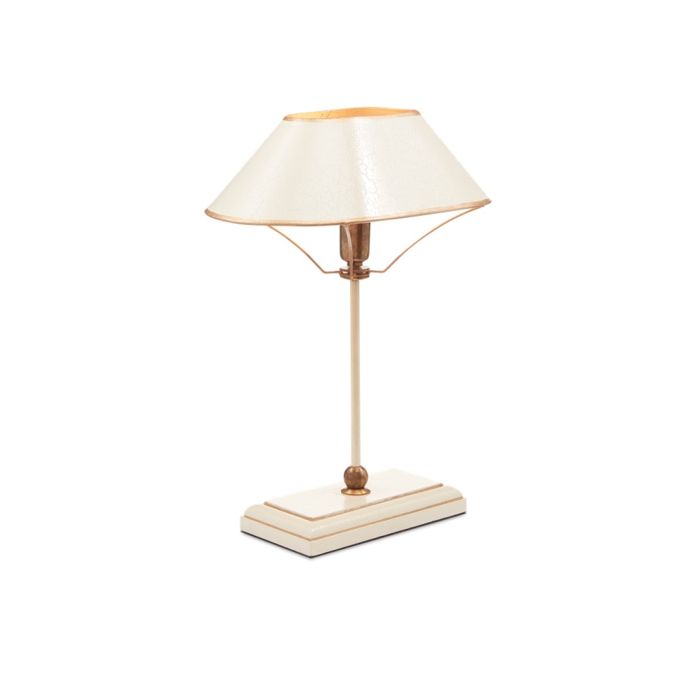 The Daphne Table Lamp looks as if it is made of one material in three distinctive finishes but the base is made of wood while the other elements on the ivory table lamp are made of wrought iron and brass in antique brass and gold finishes. The shape of the oval shade with its painted trim is a design detail worth noting.