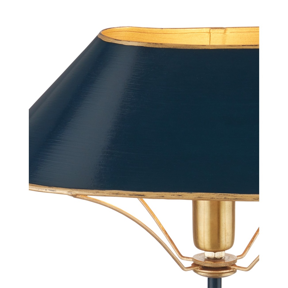 The Daphne Table Lamp looks as if it is made of one material in two distinctive finishes but the base is made of wood while the other elements on the navy-blue table lamp are made of iron and brass. The shape of the oval shade with its painted gold trim is a design detail, as is the gold finish on the interior of the shade that will warm the light bouncing off it.