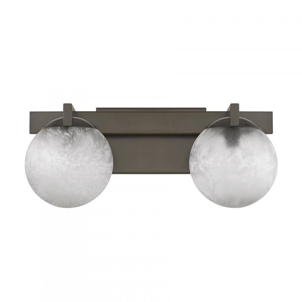 The Savoy House Darien is a 2-light bath bar with fabulously chilly appeal. A minimal frame is finished in bold Mediterranean Bronze and holds two orbs of Ice Glass, adding sub-zero cool with tons of frosty texture. Darien is 7.25" in height, 17" in width and extends 7.25" from the wall. Uses two candelabra size bulbs of up to 60 watts per bulb. Bulbs not included. This bath bar is damp area rated.