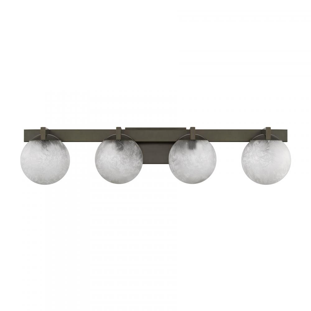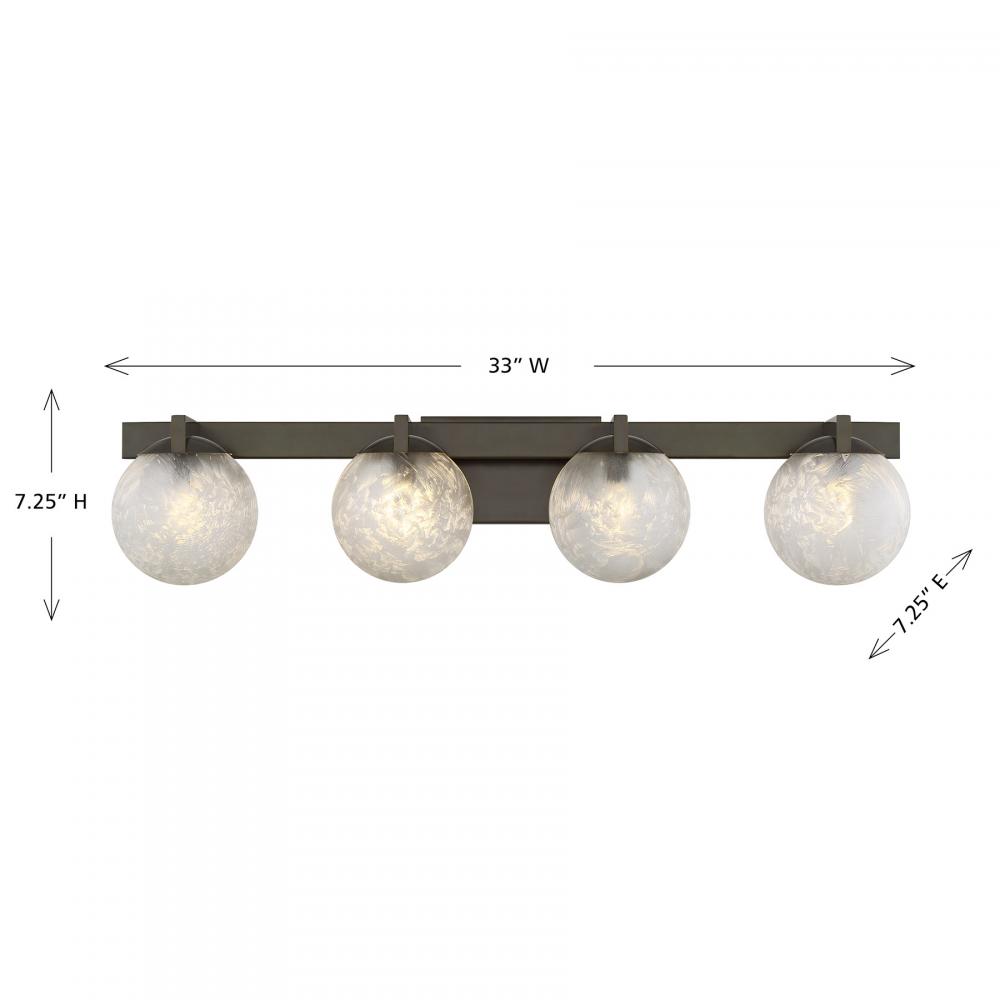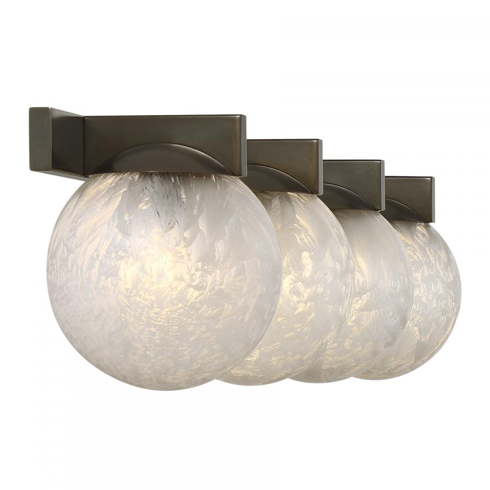 The Savoy House Darien is a 4-light bath bar with fabulously chilly appeal. A minimal frame is finished in bold Mediterranean Bronze and holds four orbs of Ice Glass, adding sub-zero cool with tons of frosty texture. Darien is 7.25" in height, 33" in width and extends 7.25" from the wall. Uses four candelabra size bulbs of up to 60 watts per bulb. Bulbs not included. This bath bar is damp area rated.