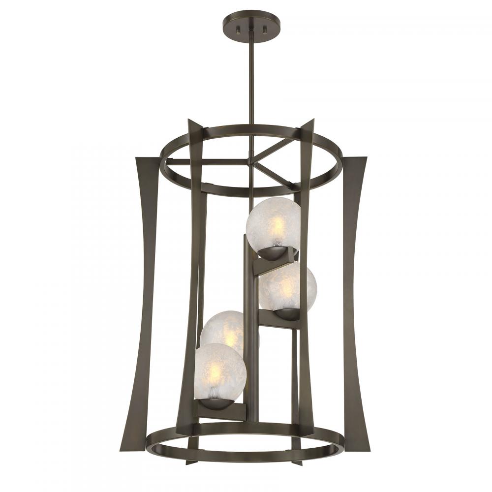 The Savoy House Darien is a 4-light foyer light with fabulously chilly appeal. A minimal, structural frame is finished in bold Mediterranean Bronze and holds four orbs of Ice Glass as if they are on a spiral staircase, adding sub-zero cool with tons of frosty texture. Darien is 23" in width and has an adjustable height ranging from 30" to 84". Uses four candelabra size bulbs of up to 60 watts per bulb. Bulbs not included. Comes with four 12" downrods and one 6" downrod.