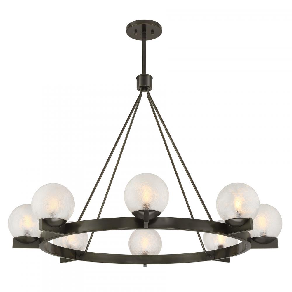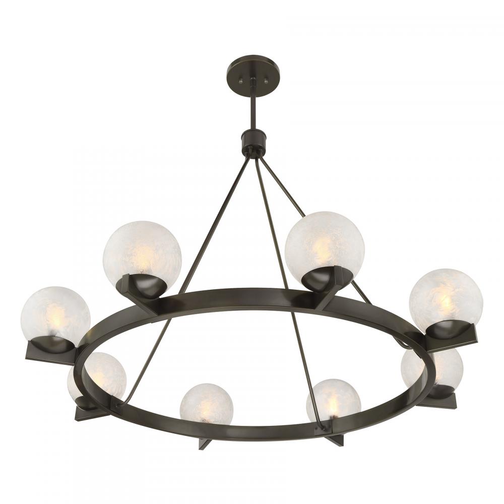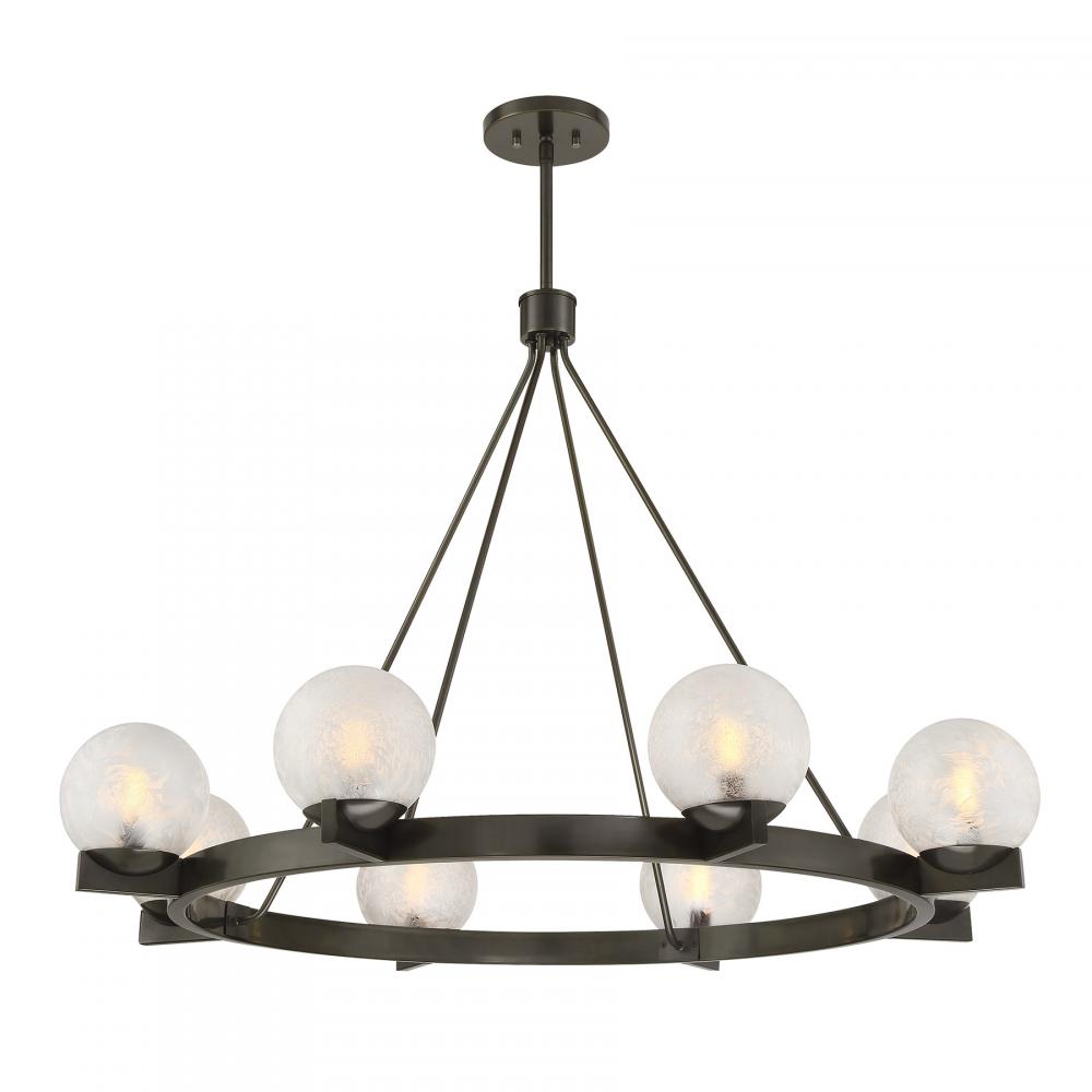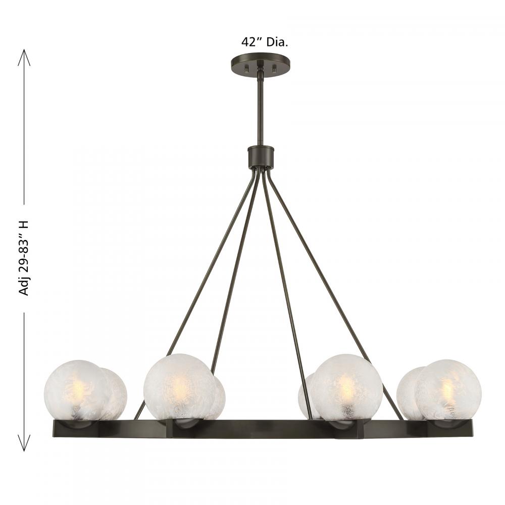 The Savoy House Darien is a 8-light chandelier with fabulously chilly appeal. A minimal, circular frame is finished in bold Mediterranean Bronze and holds eight orbs of Ice Glass, adding sub-zero cool with tons of frosty texture. Darien is 42" in width and has an adjustable height ranging from 29" to 83". Uses eight candelabra size bulbs of up to 60 watts per bulb. Bulbs not included. Comes with four 12" downrods and one 6" downrod.