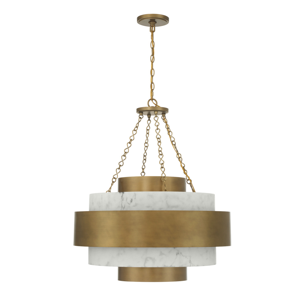 Bring radiant Art Deco–inspired style to your home with the Savoy House Davenport 6-light pendant. Its simply chic frame features bands finished in Antique Patina paired with beautifully veined faux alabaster that offers an elegant, softly diffused glow. Davenport is 32.75" in height and 28" in width. Uses six candelabra size bulbs of up to 60 watts per bulb. Bulbs not included. Comes with 120" of chain.