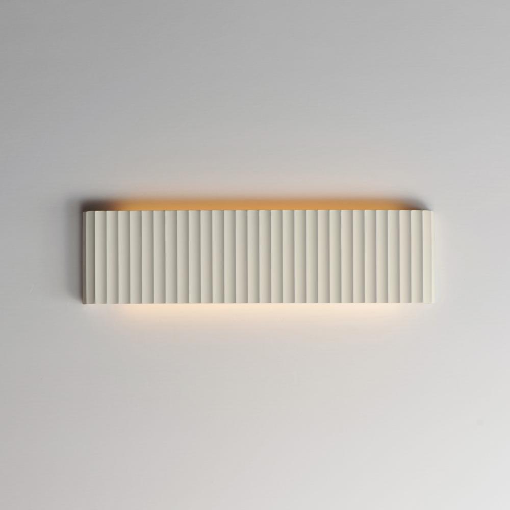 Long spans of fluted concrete panels blend Western classicism with modern technology. Scalloped concrete is finished in a Chalky White finish and suitable for damp locations. Choose from stem hung pendants or backlit wall panels that provide ambient light