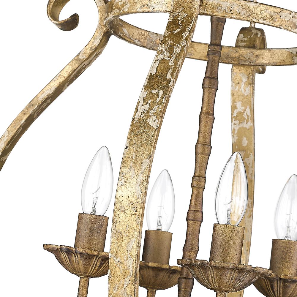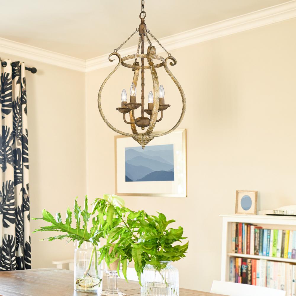 French Country-inspired, Delphine is a charming accent that is perfect for a stylish foyer or kitchen island. The fixture is two-toned with complementary finishes that create depth and dimension. Substantial yet visually light, the low-maintenance, glass-free cage features an antique Vintage Gold finish. The hardware and interior are hand-painted in a darker Burnished Chestnut color. Within the fixture’s gentle curves, scalloped cups top delicate arms and hold small candelabras. This enchanting, traditional pendant makes a strong statement.