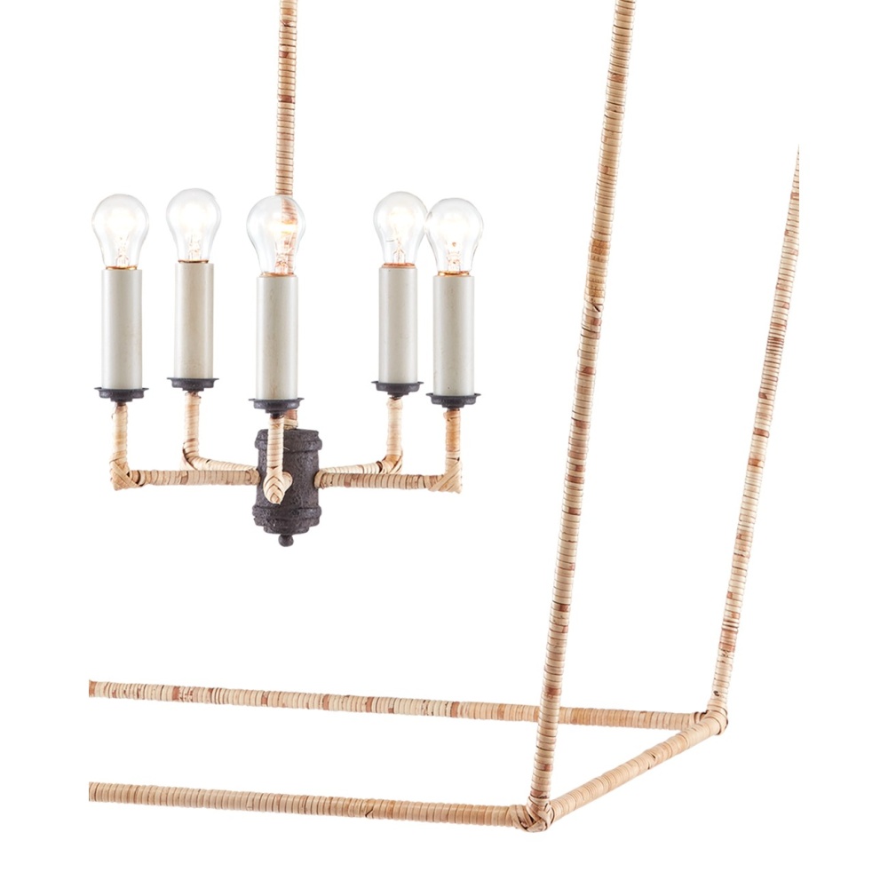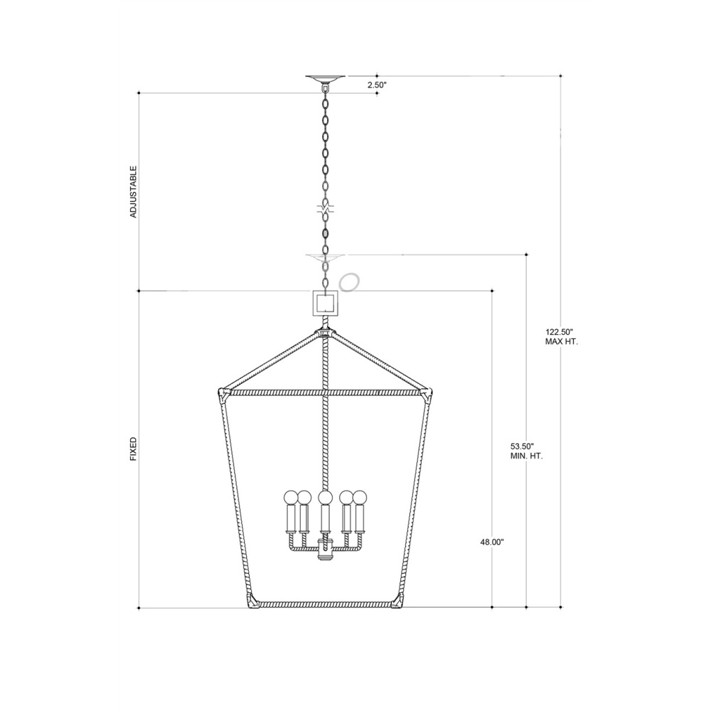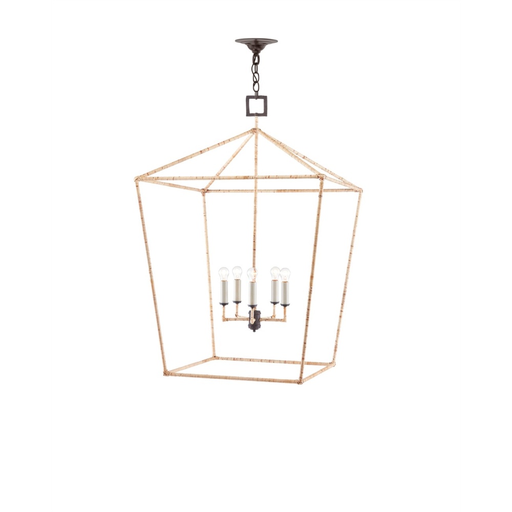 The Denison Grande Natural Lantern is a hammered wrought-iron fixture in a Mole black finish that is wrapped in rattan. The classic lantern shape has stood the test of time to make it one of our most popular offerings. A design element of note is the square that fastens the lantern to the chain. Adjustable from 53.5" to 122.5" with use of included chain/rod kit/cable. If your space calls for a longer drop, additional chain/rods/cable is available for purchase.