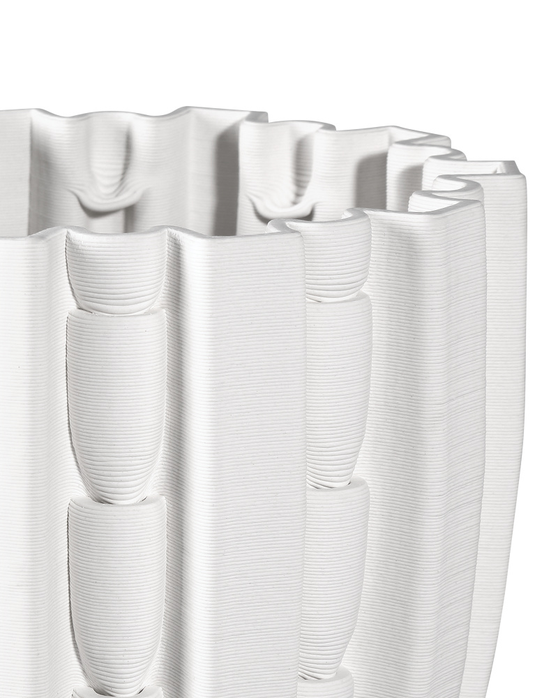 The Desert Storm Vase Set includes two oblong-shaped vases with multi-colored swirling patterns on their surfaces. The spiraling colors convey the feel of the wind as it blows sand around; the dynamic feel of the movement difficult for glassblowers to achieve given the vases are mouth-blown while the boiling glass is twisted to achieve.