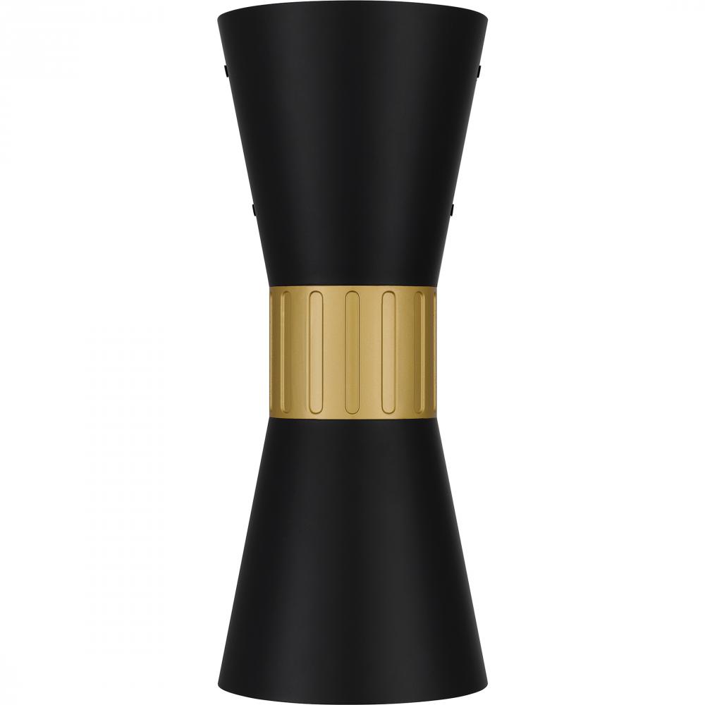 Embellish your homes exterior with the modern design of Dexter. The bold geometric silhouette is finished in matte black and features a gold textured band for an added pop of style and luxury. This outdoor sconce opens at the top and bottom to allow for ma