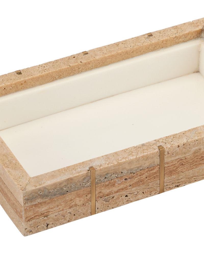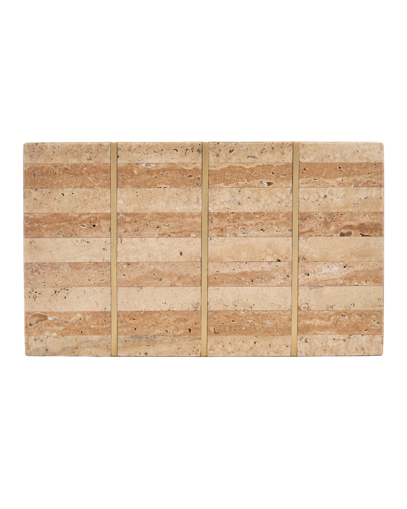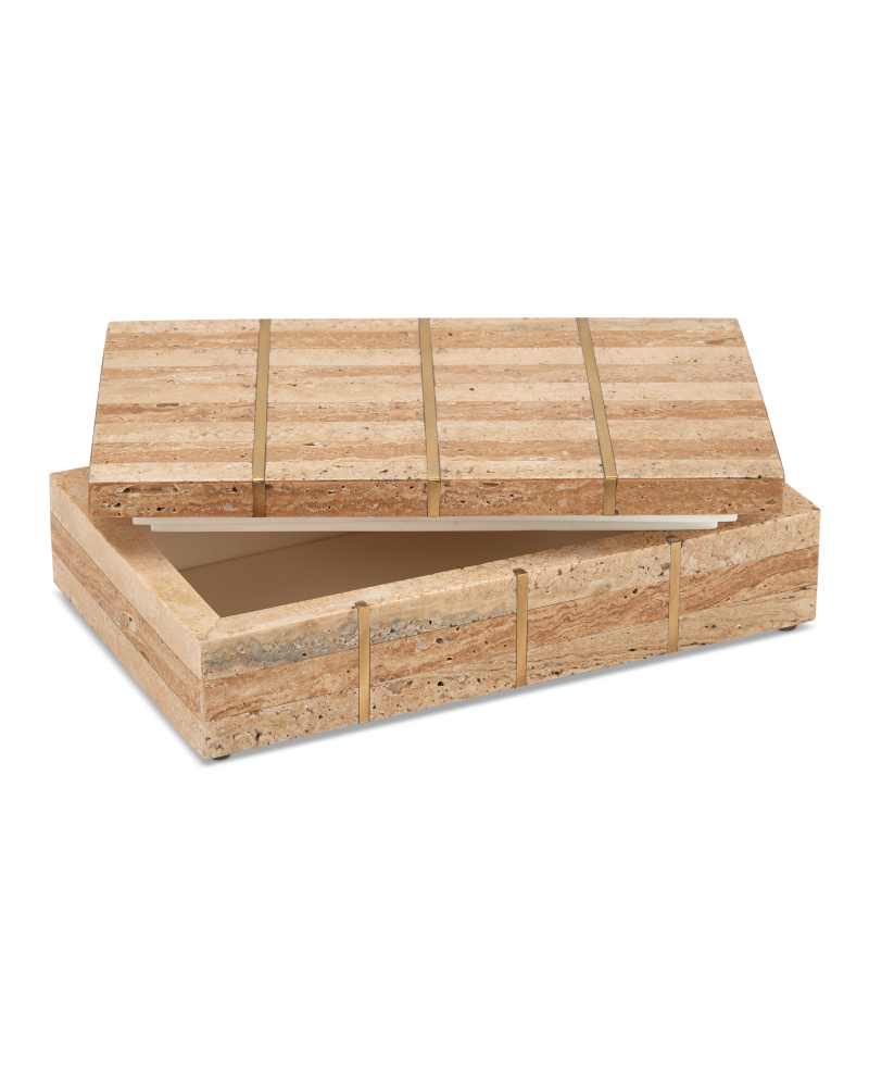 The Dezi Box is made of natural travertine tiles arranged in a stacked dark-and-light pattern with brass inlay running through them. The effect of the intermingling of materials is a pop of brightness as the light hits the metal and a hint of warmth as the stone absorbs it. The surfaces of each decorative box will vary slightly, given the natural material from which they are made.
