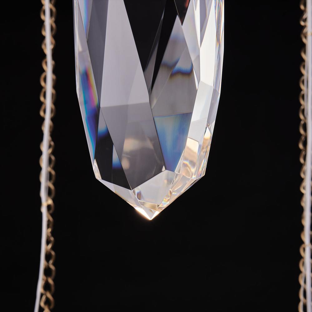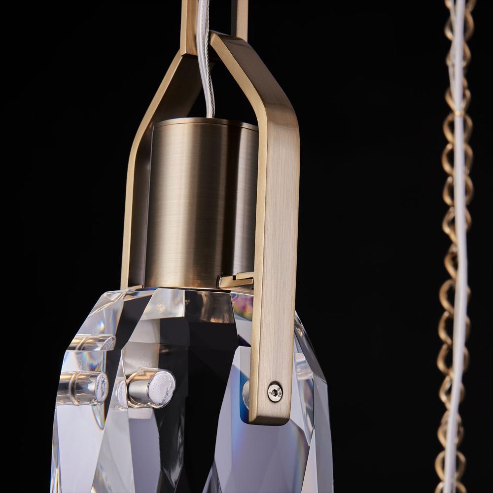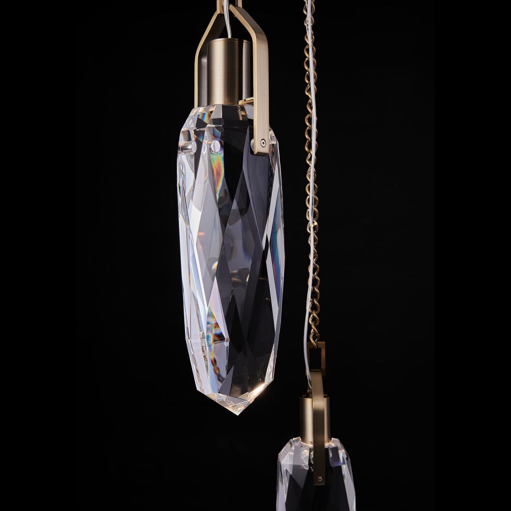 Immerse yourself in the opulent allure and contemporary sophistication of the Diamante Collection. Each lighting piece showcases a magnificent, chunky faceted crystal, gracefully suspended from an ornate, jewelry-inspired chain. With energy-efficient LED lighting and a refined Winter Brass finish, these fixtures infuse any space with a touch of elegance.