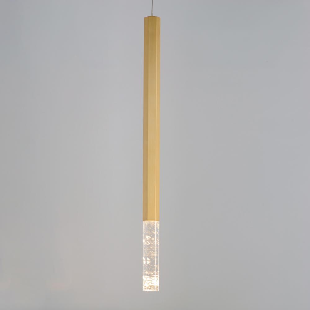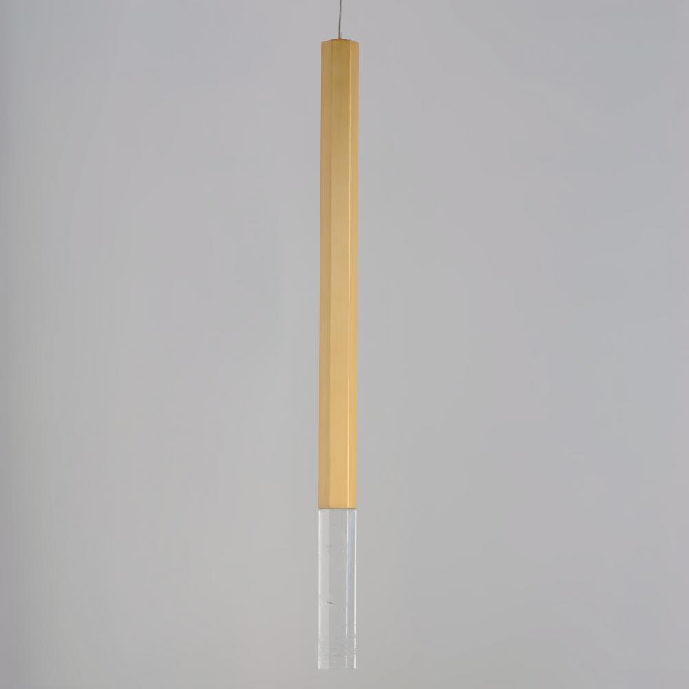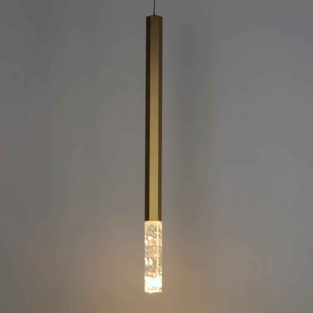 Hexagonal tubes of various lengths support blocks of naturally translucent rock crystal. Each stone varies in diaphaneity making a unique display of refracted light. Available in a plated soft Gold or Matte Black, this luxurious LED pendant light cluster a