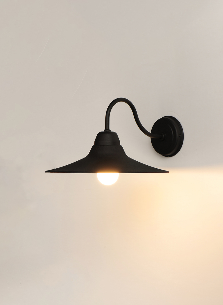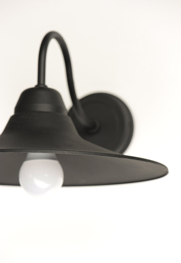 A powder coat aluminum frame support a durable polycarbonate shade in classic RLM styles. This an excellent choice for extreme environments like coastal areas. The combination Black frame and White shade create a dramatic look.