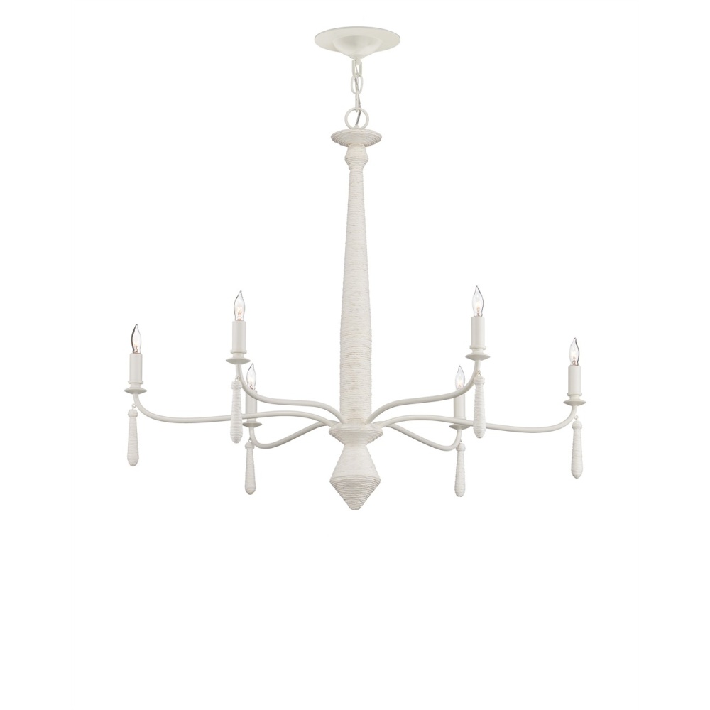 The Donnybrook Chandelier is a textural work of art that combines a contemporized traditional shape and pendants wrapped in Kraft paper twine. The pale material, the wrought iron forming the undulant arms, and the hardware are made seamless when a snow white finish is applied. Adjustable from 35.5" to 103.5" with use of included chain/rod kit/cable. If your space calls for a longer drop, additional chain/rods/cable is available for purchase.