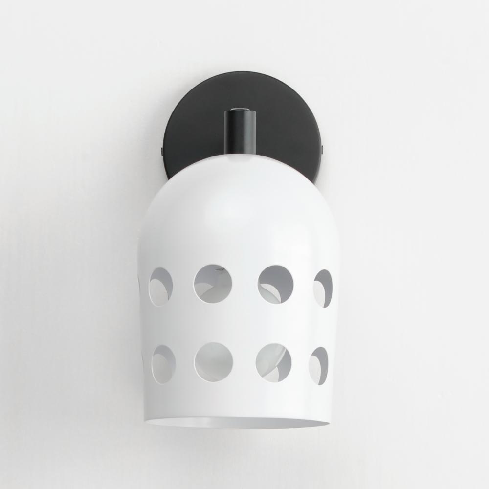 Retro configurations of Mid-Century Modern perforated metal designs inspire this collection of pendants, wall and ceiling mounts complete in a two tone powder coat finish. The spun metal shades are punched with large circular perforations that scatter a pa