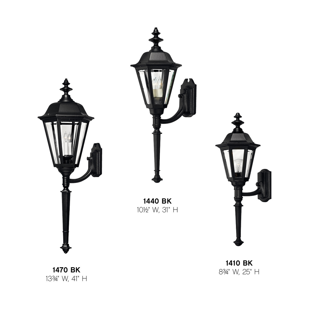 Manor House is a classic lantern design featuring durable cast aluminum, clear beveled glass panels and a bold Black finish. Select-A-Lite options come standard with both candelabra and medium based sockets.