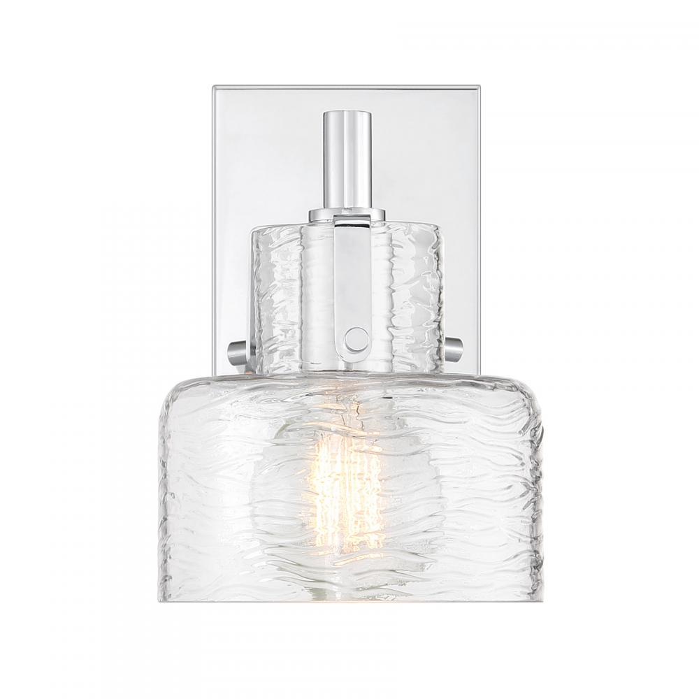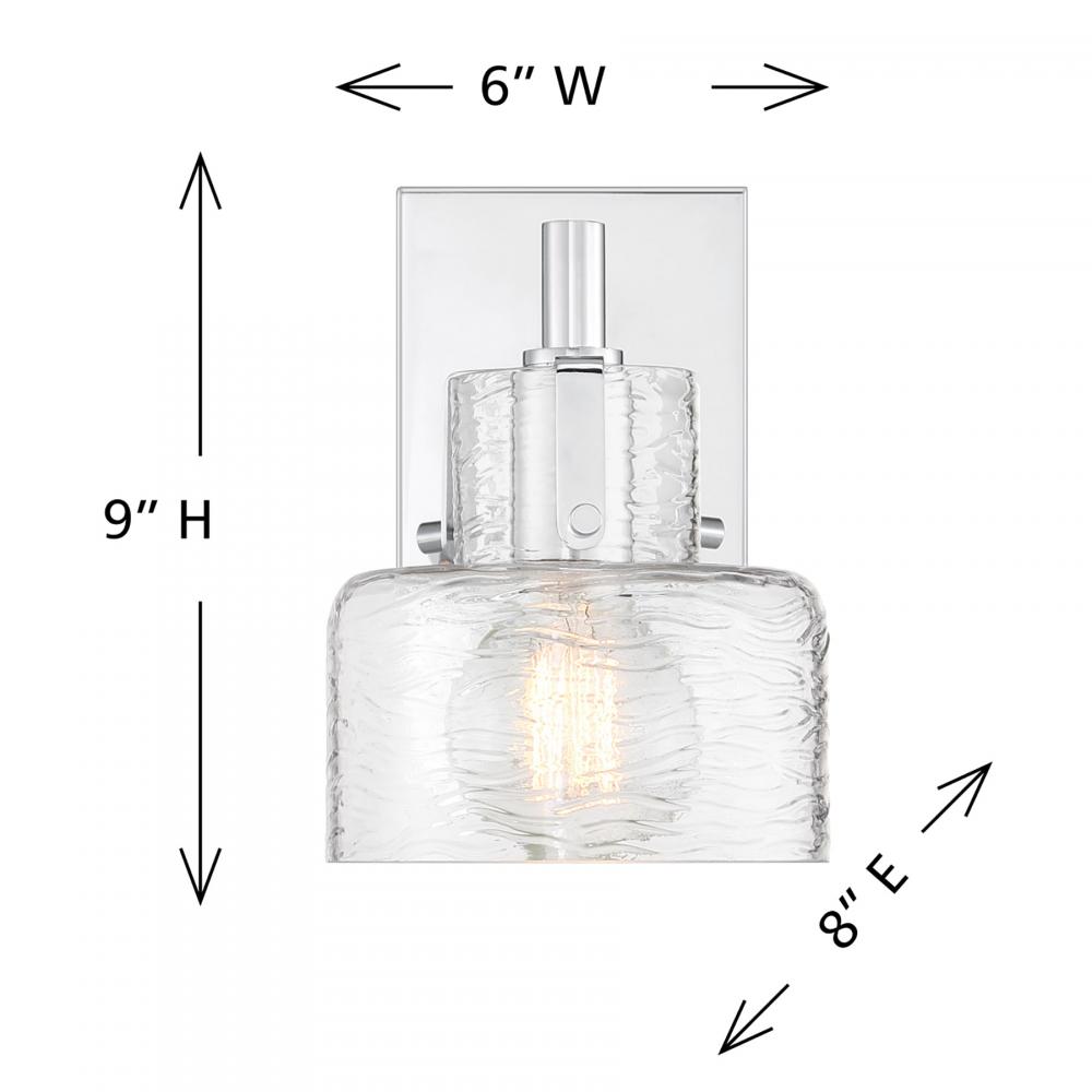 The Savoy House Dover 1-light sconce showcases standout bathroom lighting style! A clear glass shade features a beautifully textured pattern that recalls ocean waves. This glass shade is held to the base by an arm that is finished in Chrome and decorated with visible hardware to add a hint of vintage inspiration. Dover is 9" in height, 6" in width and extends 8" from the wall. It uses one standard size bulb of up to 60 watts. Bulb not included. Install as pictured. This sconce is damp area rated.