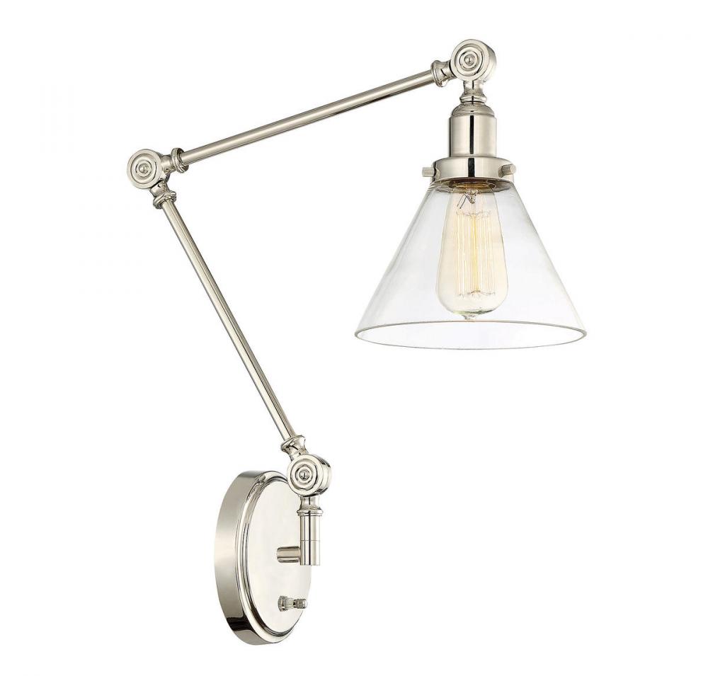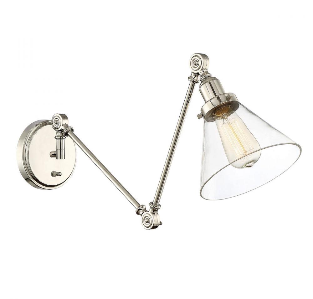 This Savoy House Drake 1-light sconce has an alluringly simple style with a few choice hardware details and a shade of clear glass. The adjustable sconce can be hard-wired or used with the included cord and plug. There is an on-off switch on the backplate. Bulb not included. Finished in polished nickel. Adjustable sconces are a perfect idea for use at the bedside, taking the place of bedside table lamps, and are also ideal task lighting for living rooms and other spaces! The polished nickel finish can be paired with nickel hardware or mixed with hardware in other fixtures. Add Drake to industrial, transitional or contemporary rooms for a bold look. When you choose a Savoy House lighting fixture, you can be certain you’ve selected a piece that will withstand the test of time.
