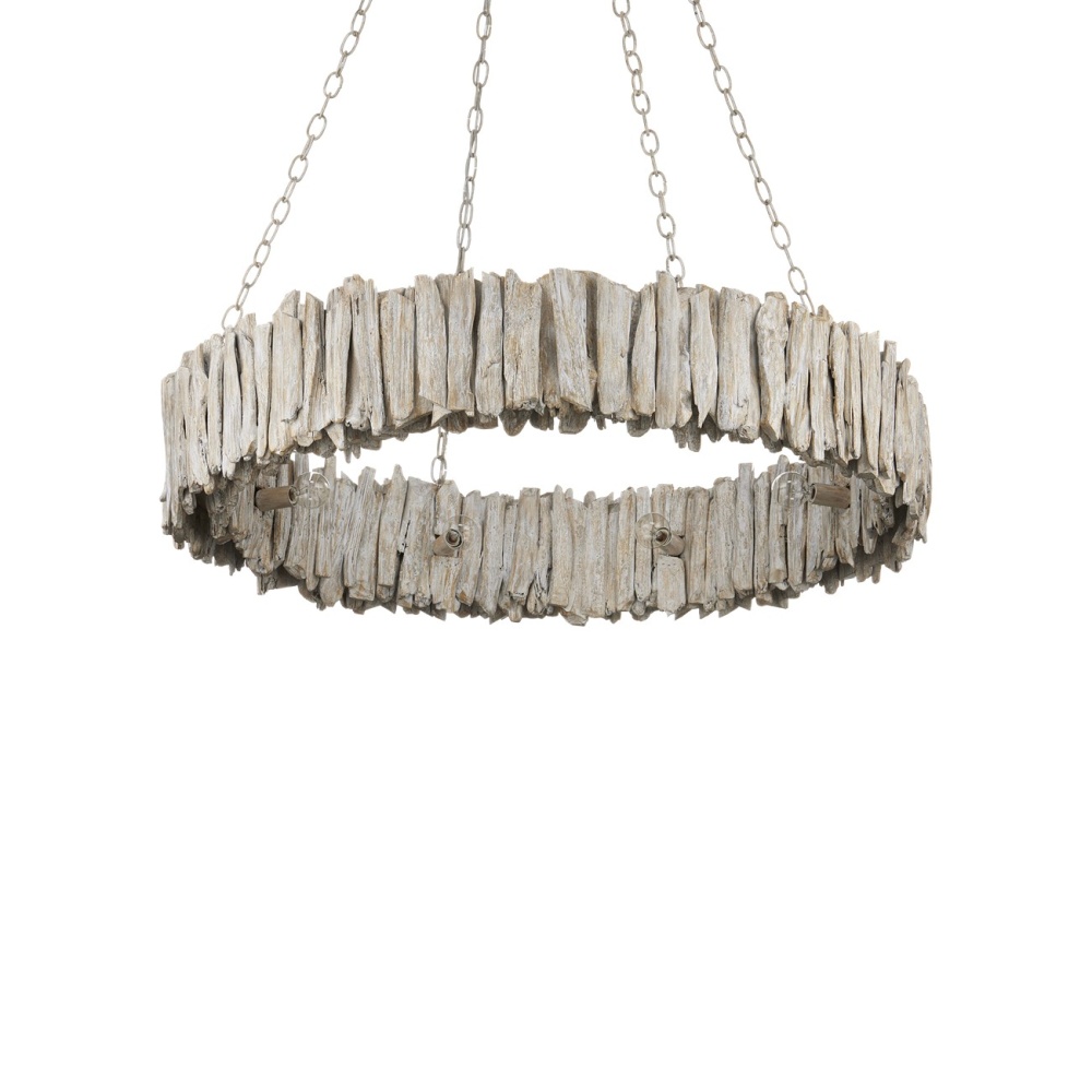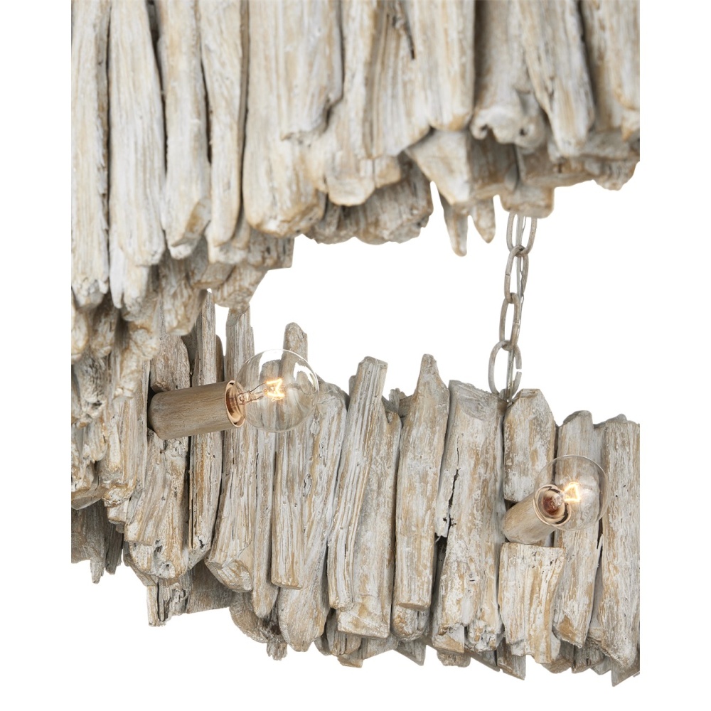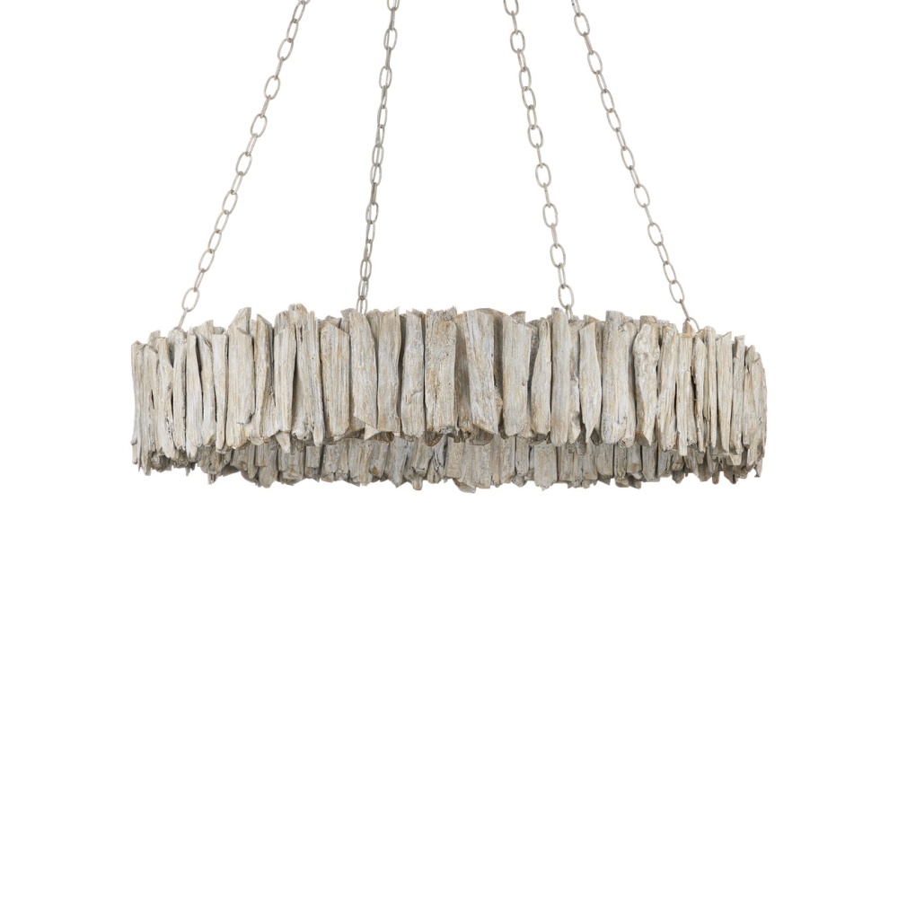The Driftwood Whitewash Ring Chandelier is crafted from hand-selected pieces of natural driftwood. The wrought iron frame and the wood pieces are in a whitewashed driftwood finish that makes this a seamless tone-on-tone composition. The Driftwood is a perfect choice for any home with a coastal or lakeside aesthetic. Adjustable from 24" to 82" with use of included chain/rod kit/cable. If your space calls for a longer drop, additional chain/rods/cable is available for purchase.
