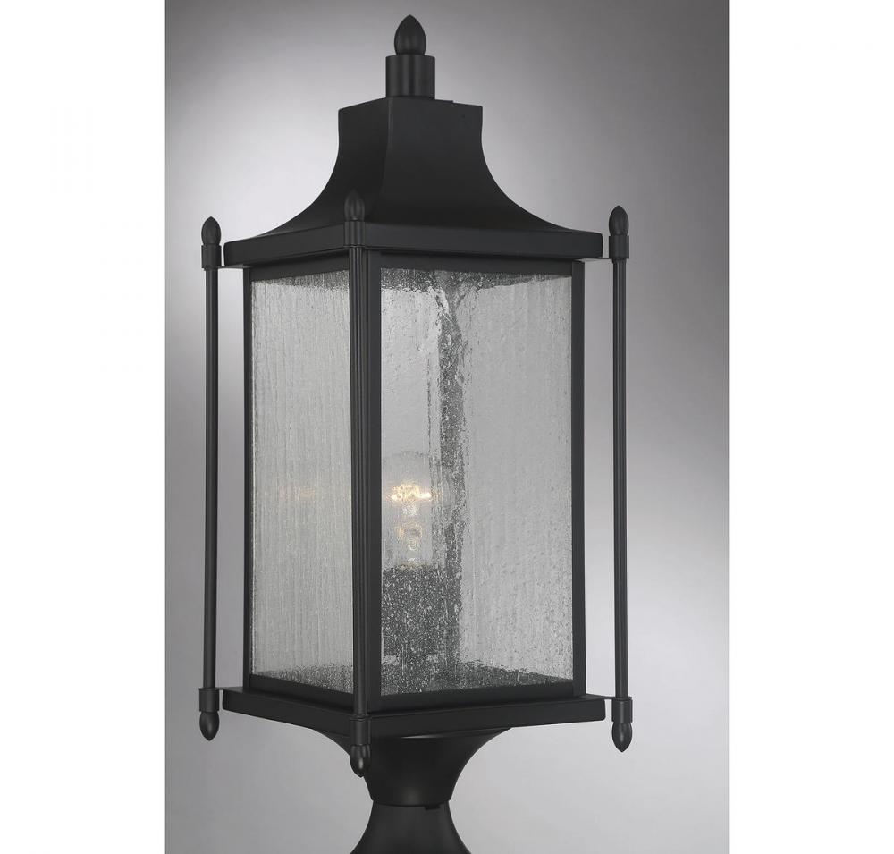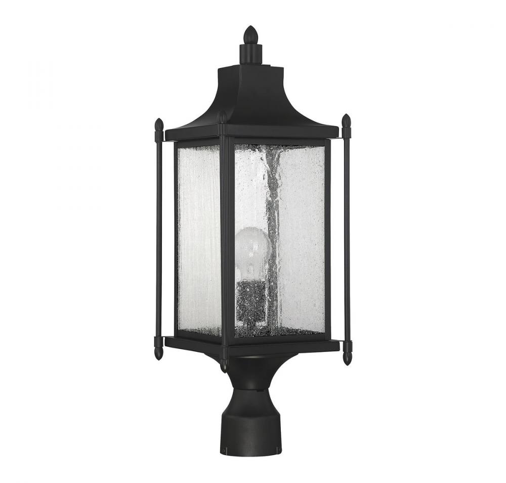 Featuring a design that is classic Americana, this Savoy House Dunnmore 1-light outdoor post light adds timeless elegance to the outdoor areas of your home. A high quality black finish blends incredibly well with many other hardware types and architectural materials. The traditional box shape is enhanced with slim outer columns, delightful finials and a graceful curved mansard roof. Panes of beautiful clear seeded glass add to the vintage charm and this wall lantern holds one 60W standard size bulb for ample, safe and welcoming illumination. It’s 8" wide, 23.5" high and UL rated for wet locations, so it's perfect to give inviting, classic style to your porch, patio, sunroom, pergola or other walls of your outdoor living areas.
