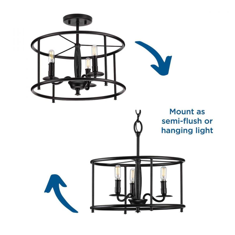 This Versatile Semi-Flush Convertible From The Durrell Collection Will Easily Find A Home In A Variety Of Settings In Need Of Generous Illumination. A Round Open-Cage Frame Coated In A Farmhouse-Style Black Finish Highlights The Light Fixture’S Rustic Demeanor. Inside The Frame Nestle Light Bases Reminiscent Of Vintage Candlesticks On Gently Curving Metal Arms. A Wooden Column At The Ceiling Light’S Center Is Coated In A Cerused Black Finish And Creates A Mixed-Element Aesthetic.