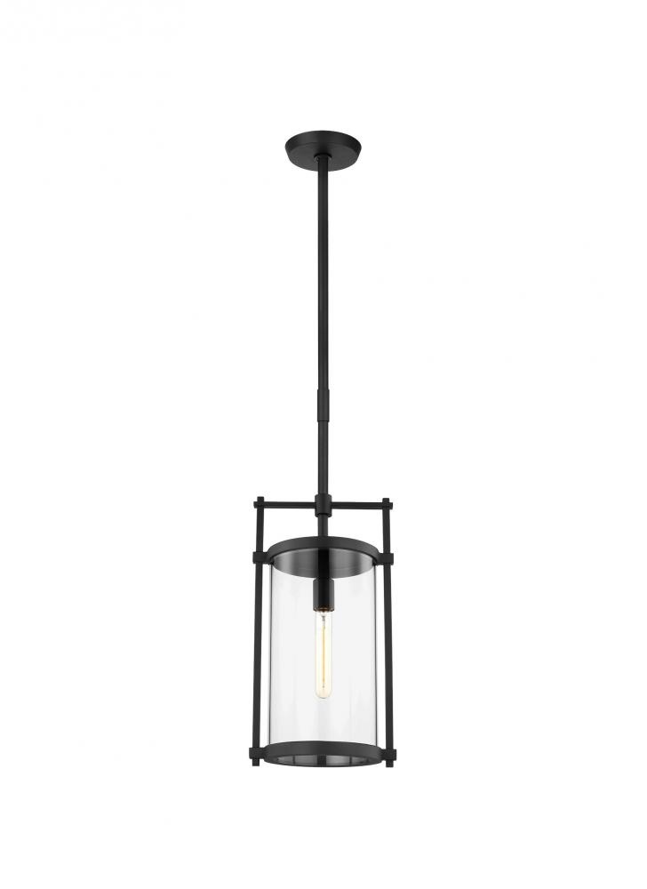 The Eastham one light outdoor pendant fixture in textured black by Chapman & Myers is designed with an upright square metal crossbar which extends beyond the top and bottom of each light to both support and define each light. The crossbars intersect two stepped top & bottom metal rims and capture the cylindrical glass shade. Each is illuminated by a tubular filament bulb.