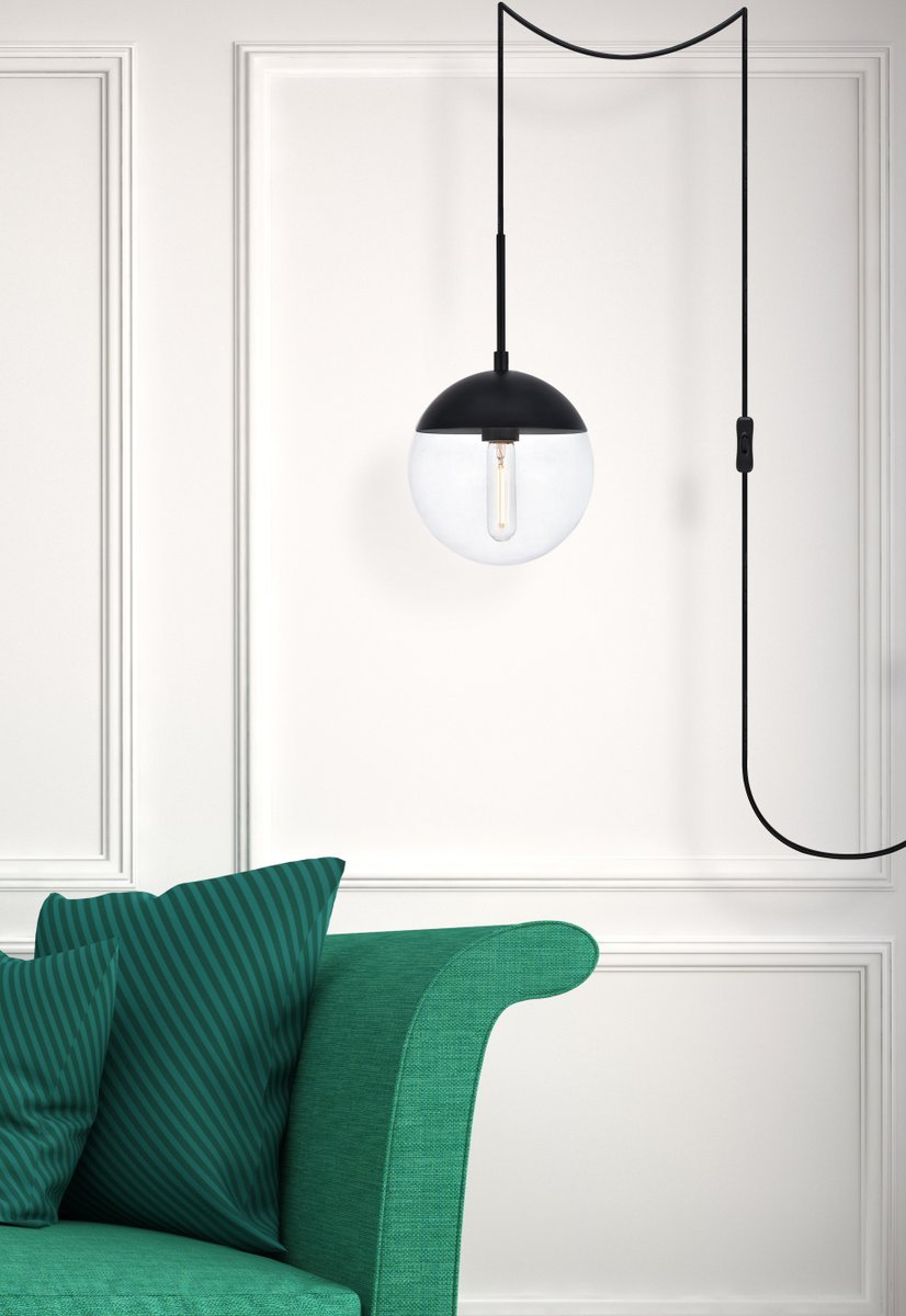 Refined style with a practical design, Eclipse plug in pendant lamps bring cosmopolitan sophistication anywhere, especially to an entryway, office, bathroom, bedroom, or kitchen. The smooth iron round frame comes in a black finish. A 15 foot black cord allows you to vary the hanging height off the swag hooks. Since this is a plug-in you can move it around easily to add light wherever you go. A touch of color on top of the clear spherical glass shade brings character to this classic style. Living in the big city has never been this easy. Simply hang this piece on the provided swag hooks and plug it in for an effortlessly easy installation - can be hung from a sloped or vaulted ceiling.