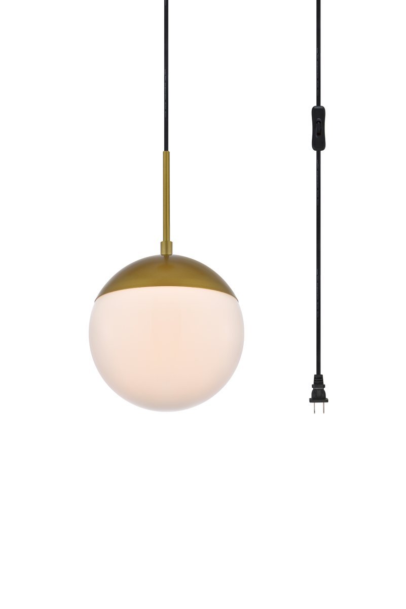 Refined style with a practical design, Eclipse plug in pendant lamps bring cosmopolitan sophistication anywhere, especially to an entryway, office, bathroom, bedroom, or kitchen. The smooth iron round frame comes in a brass finish. A 15 foot black cord allows you to vary the hanging height off the swag hooks. Since this is a plug-in you can move it around easily to add light wherever you go. A touch of color on top of the frosted white spherical glass shade brings character to this classic style. Living in the big city has never been this easy. Simply hang this piece on the provided swag hooks and plug it in for an effortlessly easy installation - can be hung from a sloped or vaulted ceiling.