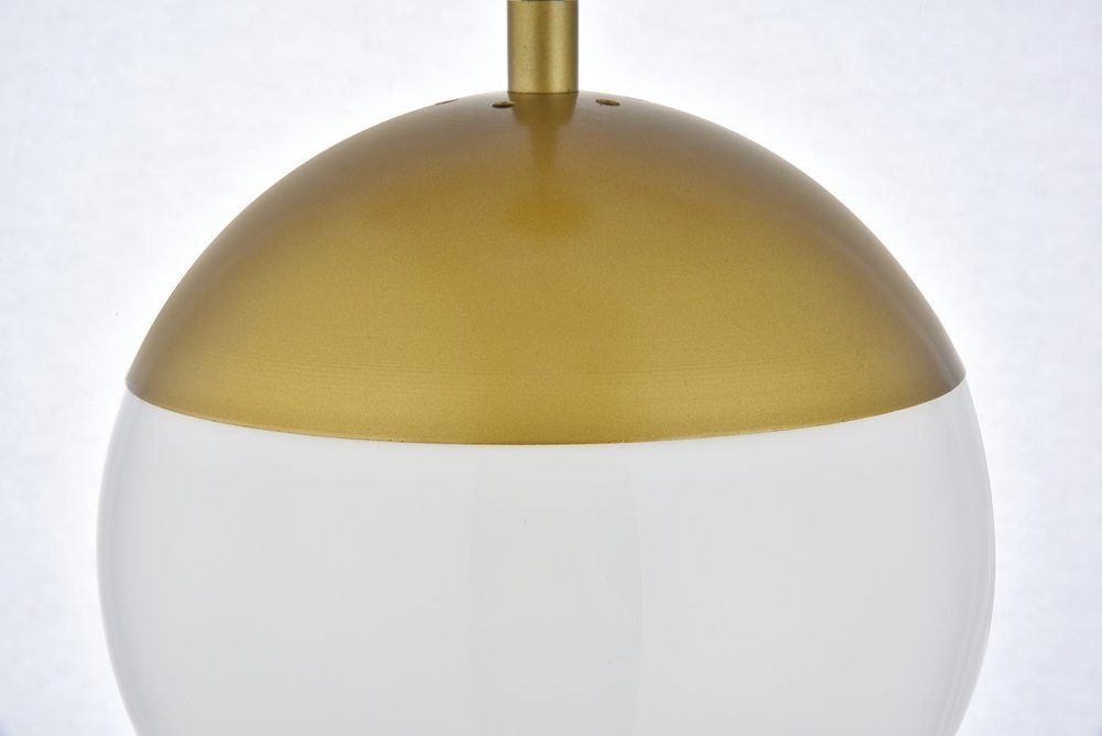 Pendant lamp features a brassand frosted white glass.