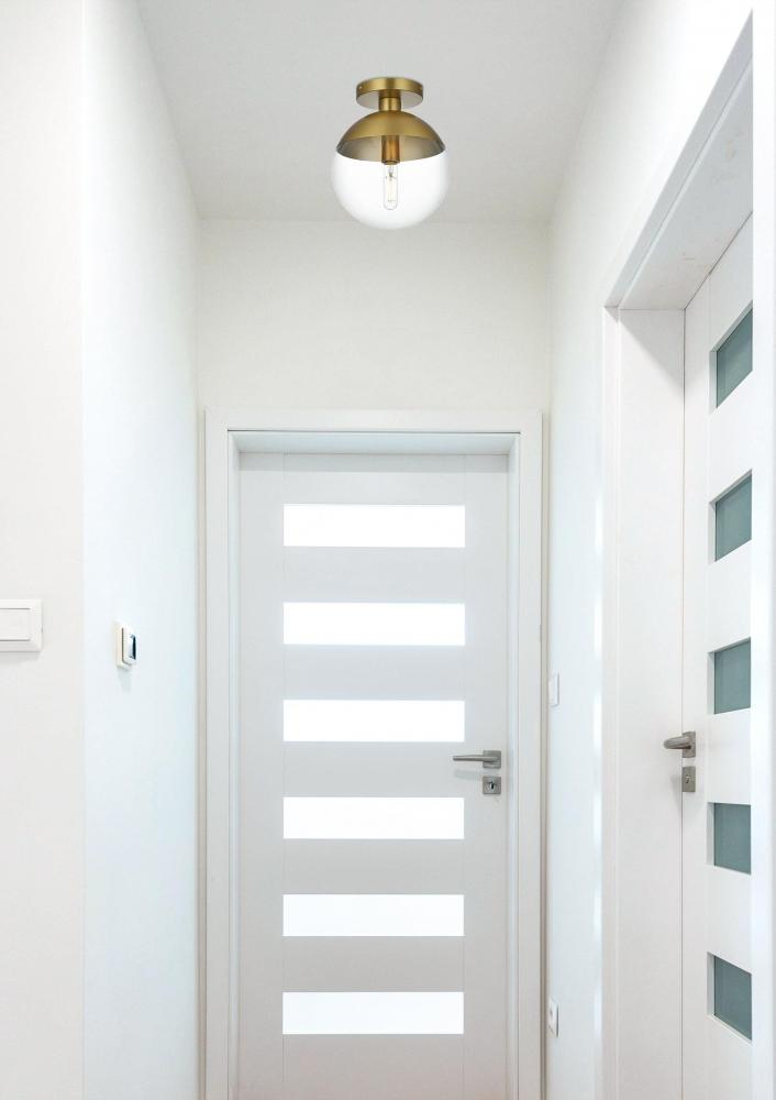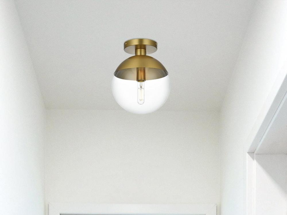 Refined style with a practical design, Eclipse flush mount bring cosmopolitan sophistication anywhere, especially to an entryway, office, bathroom, bedroom, or kitchen. The smooth iron frame features a disk-shaped canopy and comes in a satin gold or chrome finish. A touch of color on top of the clear or frosted white spherical glass shade brings character to this classic style. Living in the big city has never been this easy.
