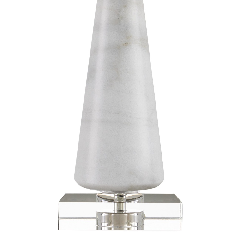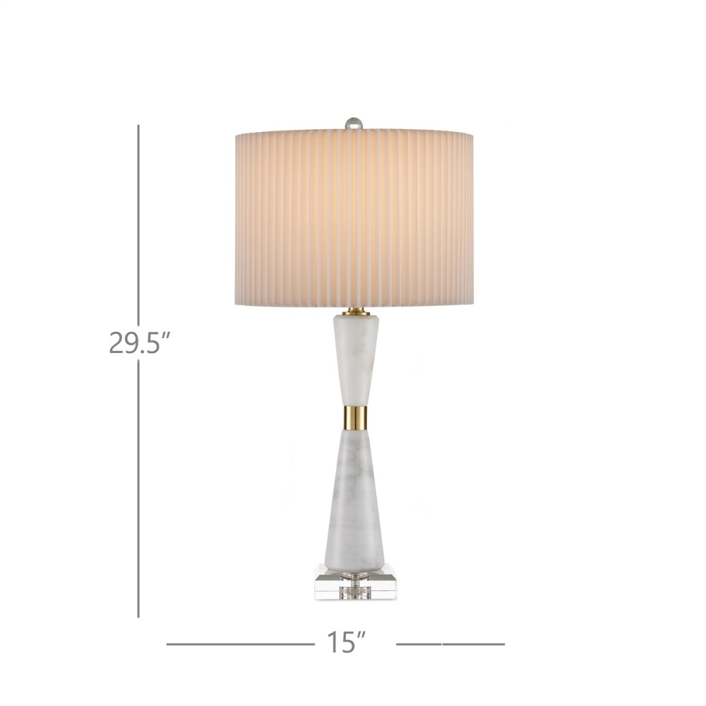 The contemporary shape of the Edelmar White Table Lamp is sleek, while the mix of materials composing it is complex. The body made of white marble cinched in the middle by a brass ring that rises from an optic crystal base. Adding to the intricacy of the design is the knife-pleated off-white shantung shade. An optic crystal finial completes the overall composition.