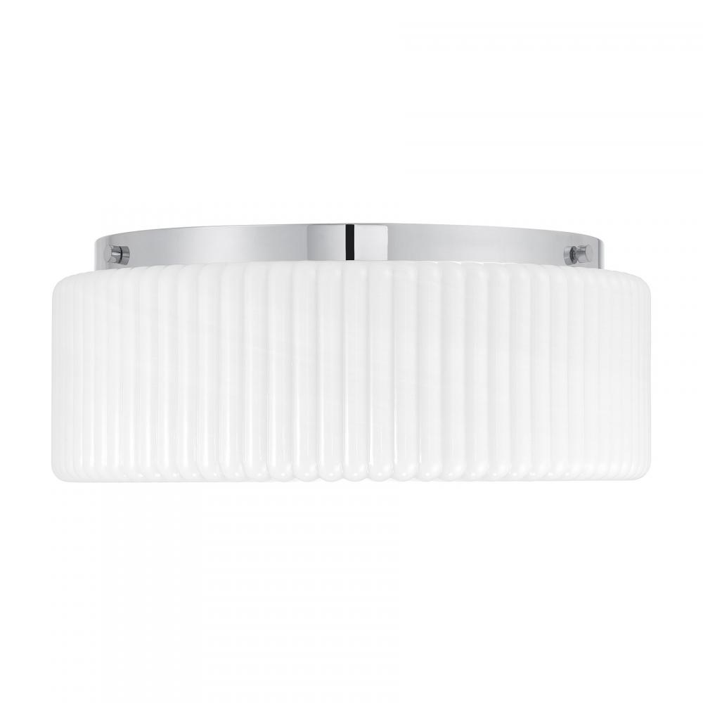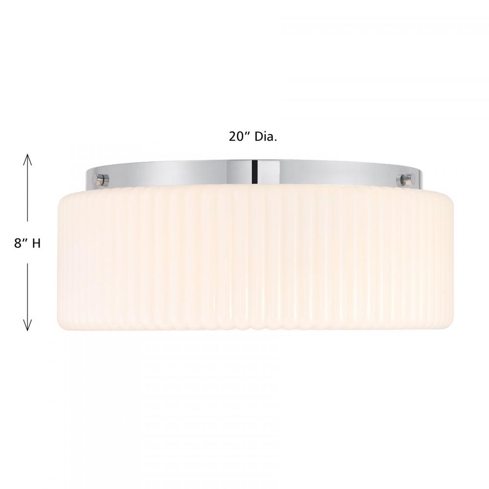 Use the vintage-inspired Savoy House Edgemont 4-light flush mount to add beautiful, vivid brightness to any room! The ribbed shade of strie glass brings in a big dose of eye-catching texture and the Chrome finish is extremely versatile. Edgemont is 8" in height and 20" in width, making it an excellent option for larger spaces. It uses four standard size bulbs of up to 60 watts per bulb. Bulbs not included.