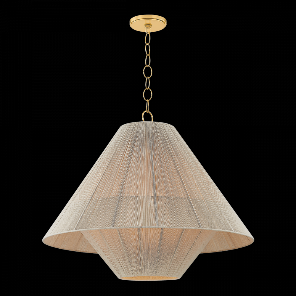 To create the casual elegance of the Eleanor pendant, two light and airy string shades are nested around a central light source. The overlapping of the conical shades creates a subtle moire effect, adding depth to the dynamic silhouette. Suspended by a simple, yet refined Aged Brass chain, Eleanor is perfect over a dining table or in a bedroom.