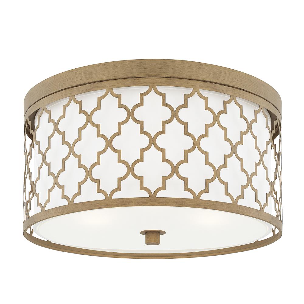 Add a chic note of style in practically any space! Our Ellis 3-light ceiling fixture has a flush-mount design that makes it just the thing for transitional spaces with lower ceilings. It features a chic quatrefoil design in our elegant Brushed Gold finish, lined with a white fabric shade and finished by a frosted glass diffuser with finial accent. The ceiling fixture is also available in our Antique Silver and Capital Gold finishes.
