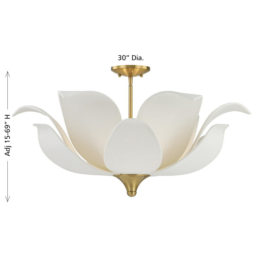 Let your style bloom with the elegant Savoy House Elsie 6-light pendant, designed by award-winning interior designer and TV host Breegan Jane. Its sculpted white linen petals curl softly around the light, giving the piece a graceful, floating presence. The Warm Brass finish makes it a lovely choice for adding beauty to any room. This pendant can also be converted to use as a ceiling semi-flush mount light! It is 15" in height and 30" in width. Uses six candelabra size bulbs of up to 60 watts per bulb. Bulbs not included.