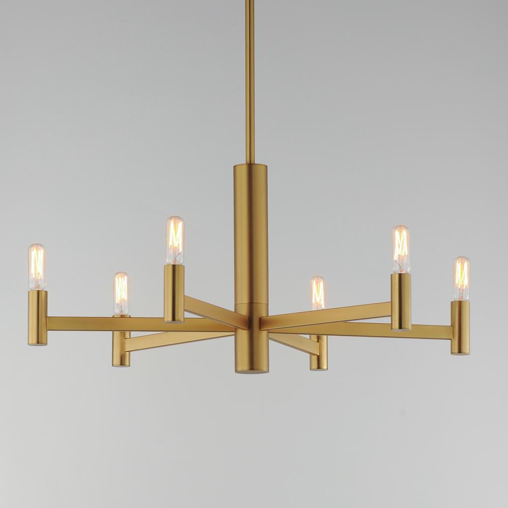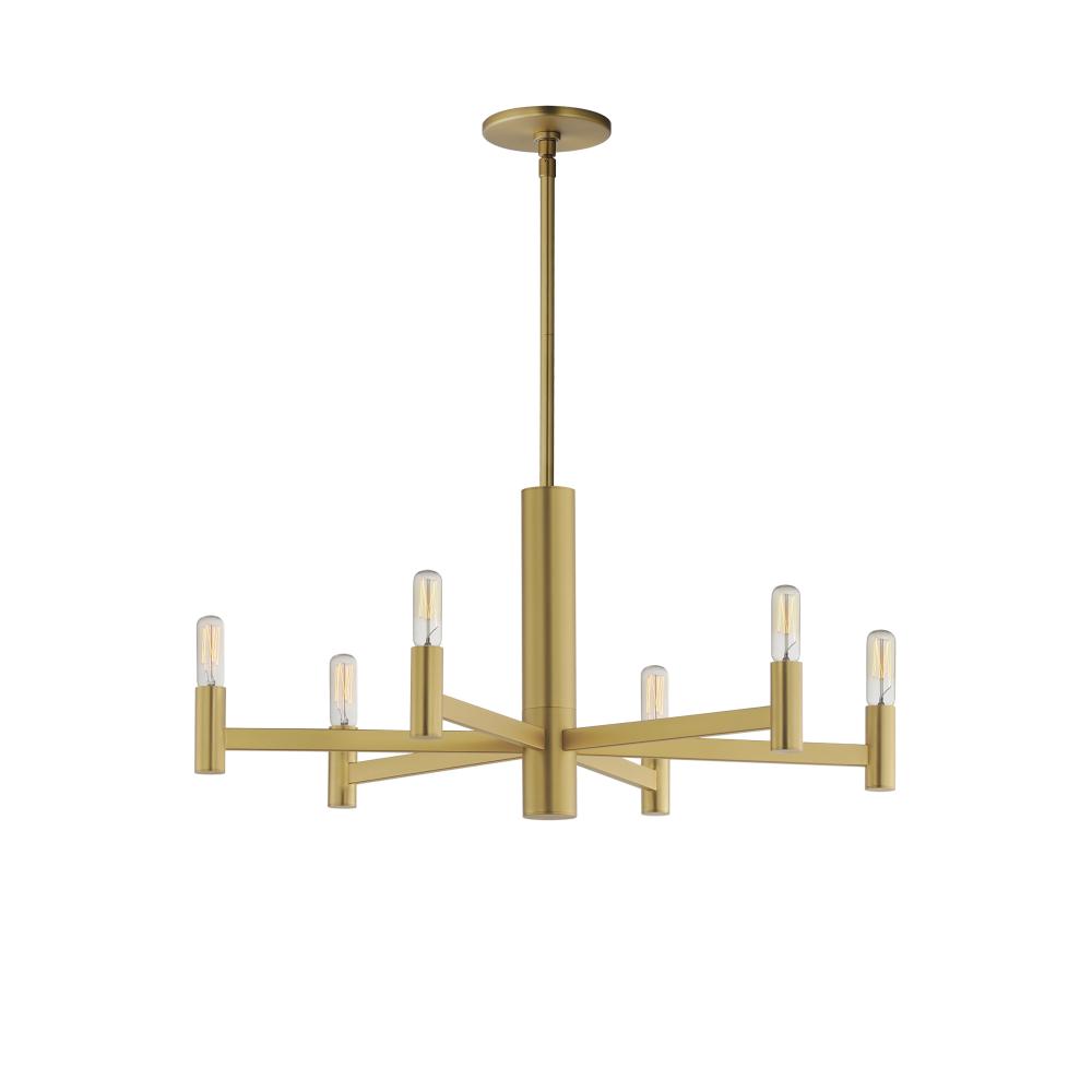 Straight extensions of rectilinear arms emanate from a cylindrical center housing in this transitional design. The candelabra is made in a corresponding cylindrical form playing into the geometries of this streamlined chandelier design. Available in a text