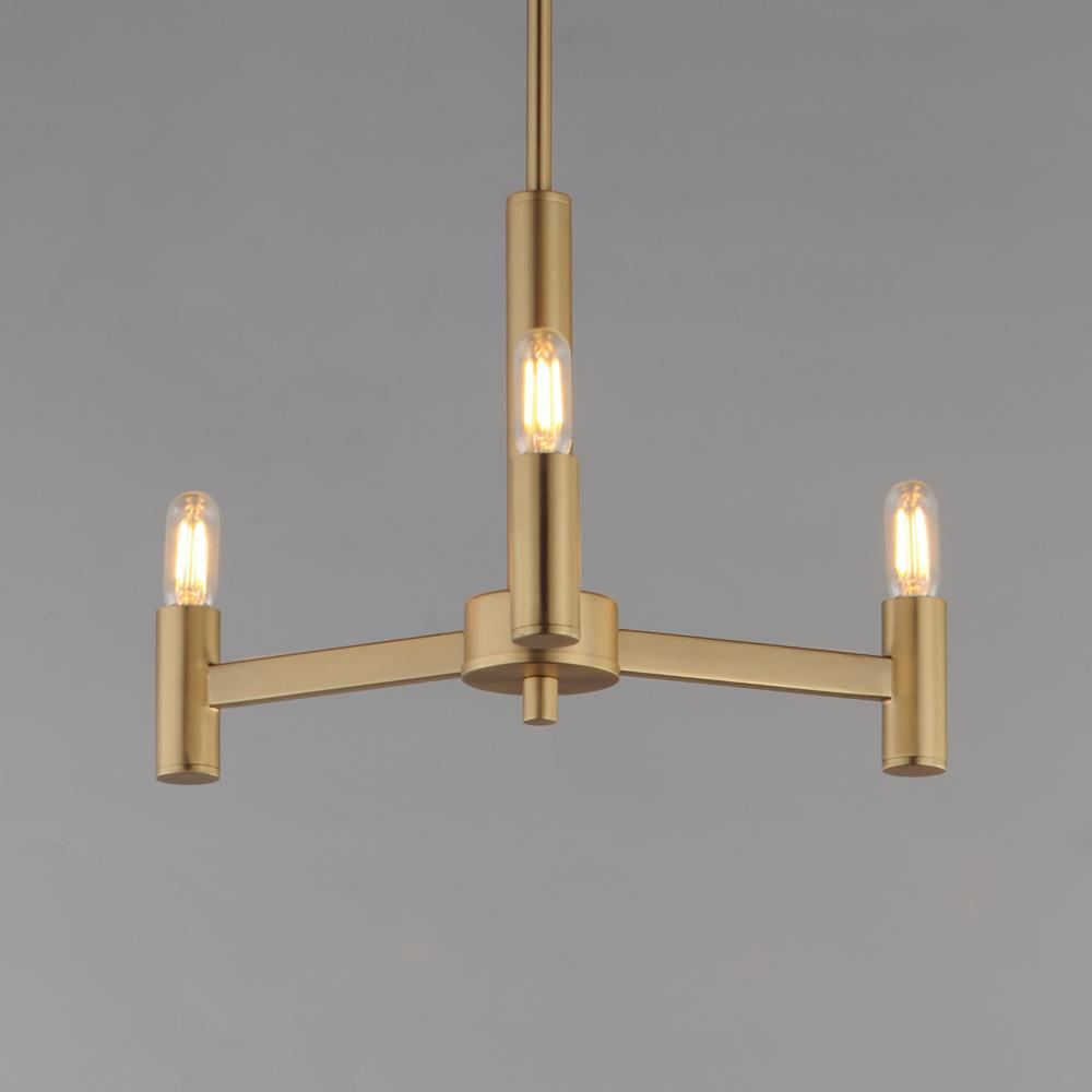 Straight extensions of rectilinear arms emanate from a cylindrical center housing in this transitional design. The candelabra is made in a corresponding cylindrical form playing into the geometries of this streamlined chandelier design. Available in a text