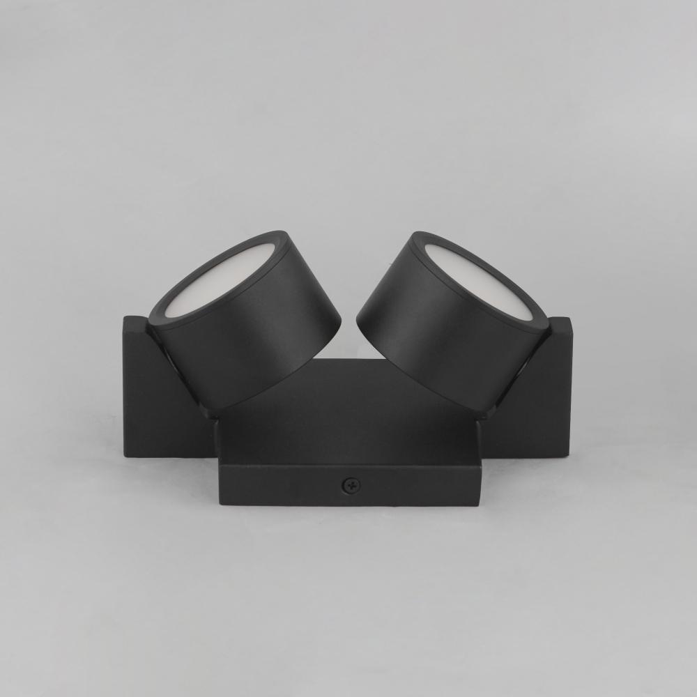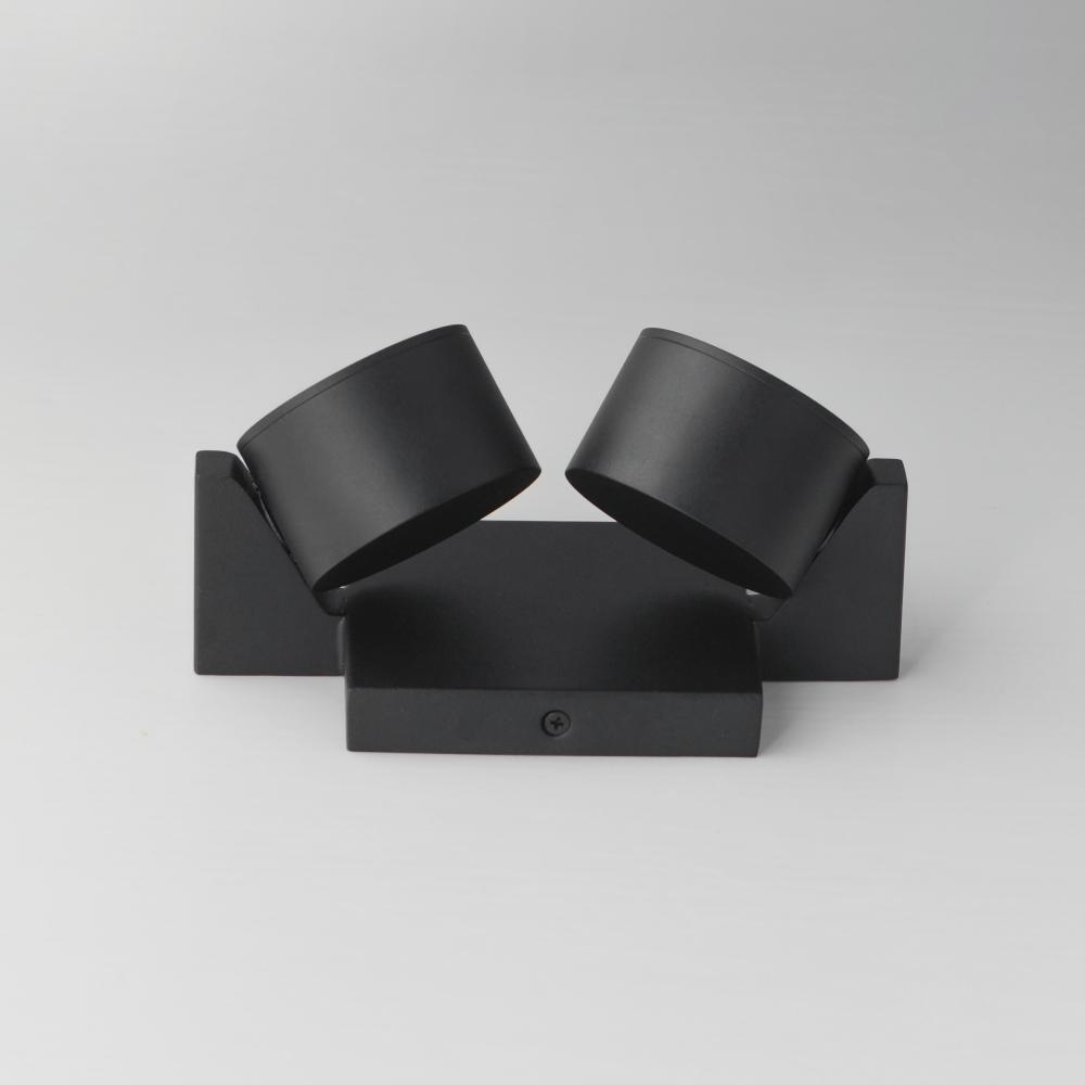 A modern matte black frame crafted with rectilinear tubing supports circular LED light modules. Designed to appear as if they are facing each other in an embrace, the modules create a harmonious and dynamic aesthetic. The two modules, positioned at opposit