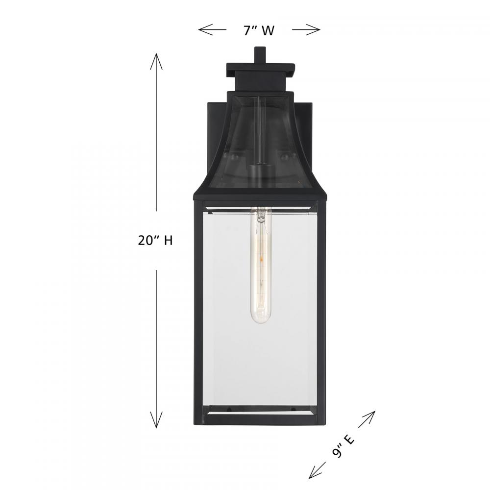 The Savoy House Emery 1-light outdoor wall lantern features a timeless style inspired by charming English cottage homes. Its curving hood and panels are all fitted with clear glass panes that give off a bright glow to light the way. The Matte Black finish is endlessly versatile. Emery is 20" in height, 7" in width and extends 9" from the wall. Uses one standard size bulb of up to 60 watts. Bulb not included. Emery is wet area rated for use in covered or uncovered outdoor areas.
