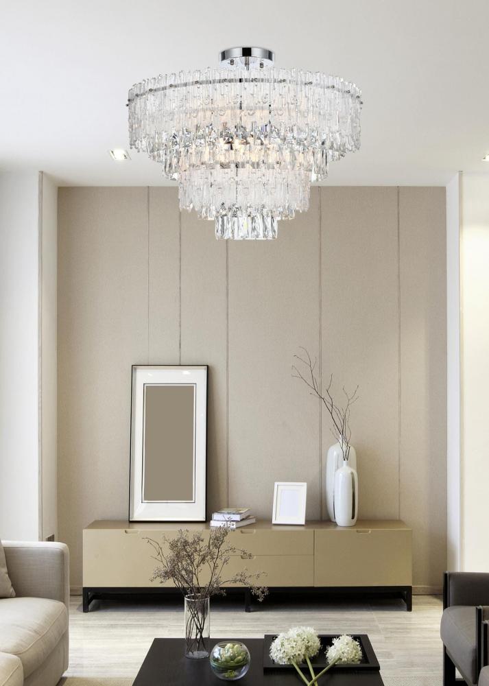 Features multiple tiers of high-quality crystal prisms that create a captivating display of light and sparkle.