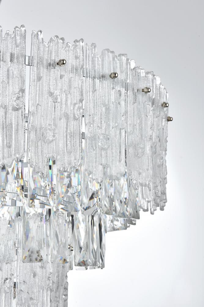 The combination of clear crystals and textured glass creates a sophisticated light play, perfect for setting an elegant mood.