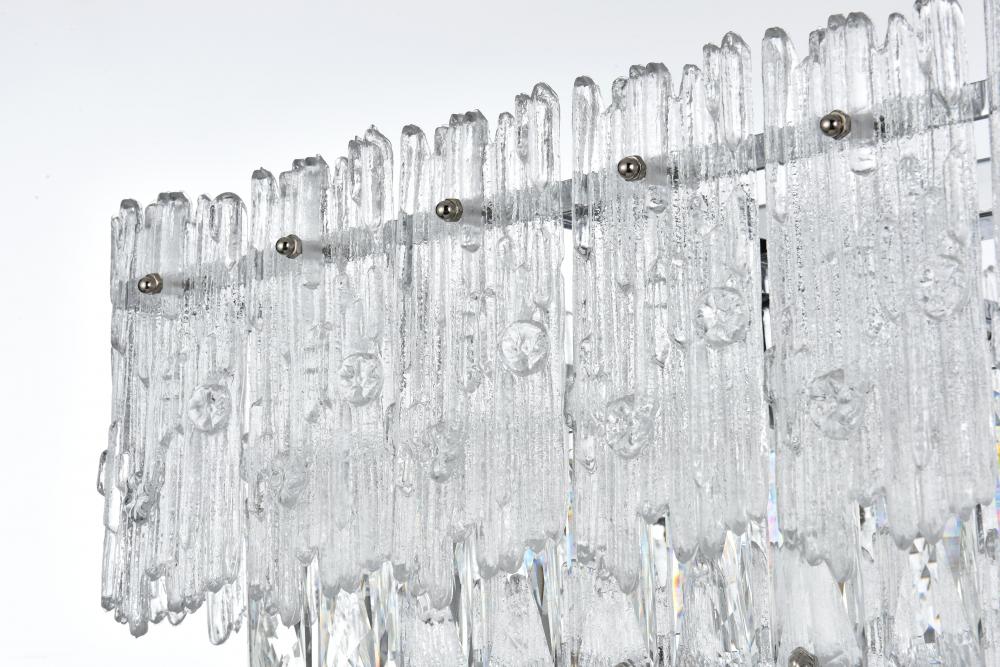 Transform your home with the opulent charm of this indoor lighting, meticulously designed to make a statement in any space. The light fixture showcases an intricate array of precision-cut clear crystals, each expertly faceted to maximize light refraction and create a dazzling display of brilliance. These crystals are complemented by textured glass accents that add depth and visual interest, casting a soft, shimmering glow across the room. Available in your choice of chrome or satin gold finishes, it is the epitome of luxury and modern elegance. As part of a coordinated collection, it also includes matching chandeliers, wall sconces and flush mounts, allowing you to create a harmonious lighting scheme throughout your home.