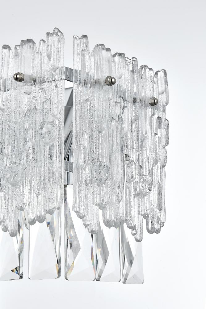 Transform your home with the opulent charm of this indoor lighting, meticulously designed to make a statement in any space. The light fixture showcases an intricate array of precision-cut clear crystals, each expertly faceted to maximize light refraction and create a dazzling display of brilliance. These crystals are complemented by textured glass accents that add depth and visual interest, casting a soft, shimmering glow across the room. Available in your choice of chrome or satin gold finishes, it is the epitome of luxury and modern elegance. As part of a coordinated collection, it also includes matching chandeliers, wall sconces and flush mounts, allowing you to create a harmonious lighting scheme throughout your home.