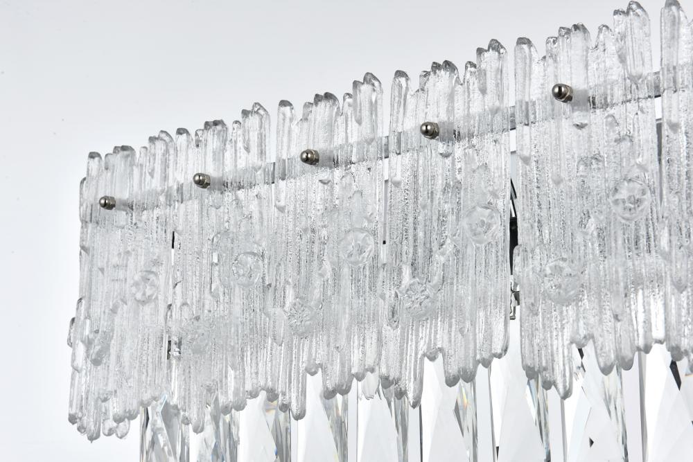 The combination of clear crystals and textured glass creates a sophisticated light play, perfect for setting an elegant mood.