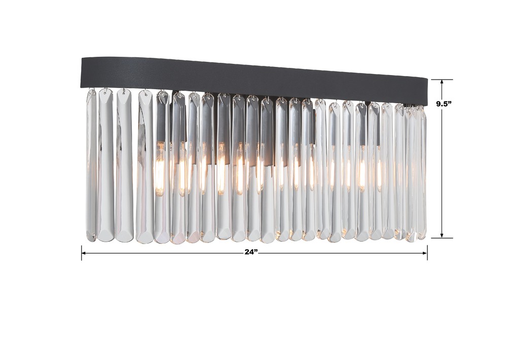 Art deco design is exemplified in this Emory collection bathroom vanity. The collection features a row of smooth glass prisms hanging from a steel frame. Both the Black Forged and Modern Gold finishes, add all the sparkle and glamour you need in a fixture.