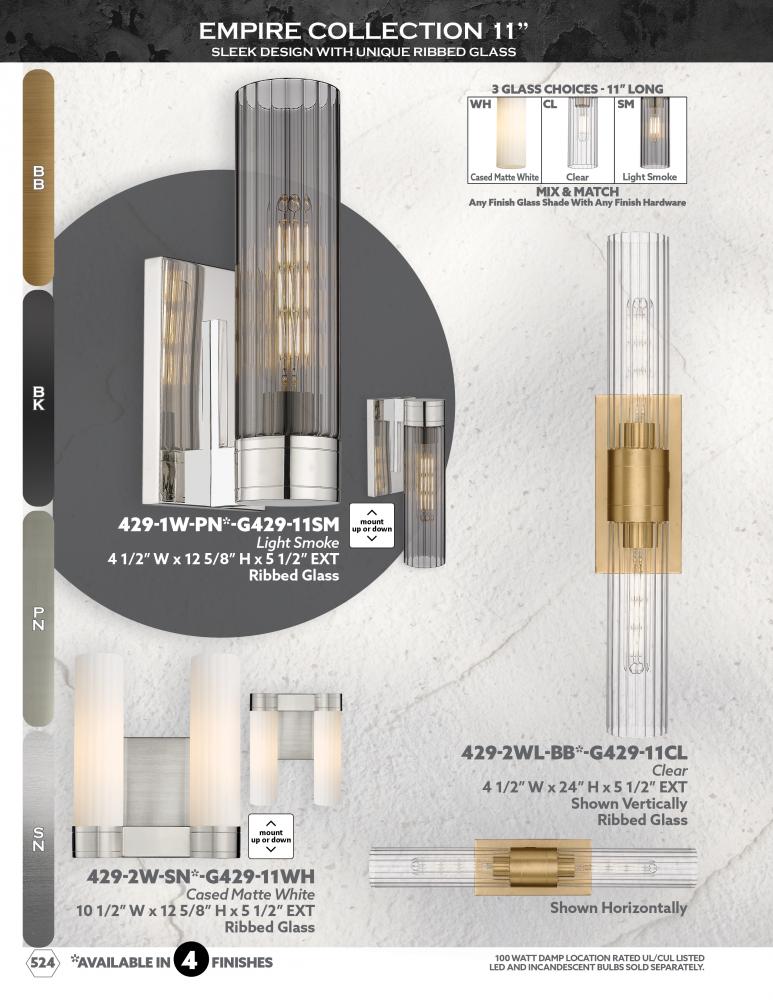 Empire is a showstopper and presents sophisticated style through subtle design. This exquisite line of fixtures features refined fluted pillar glass shades set in a delicately detailed metal frame.