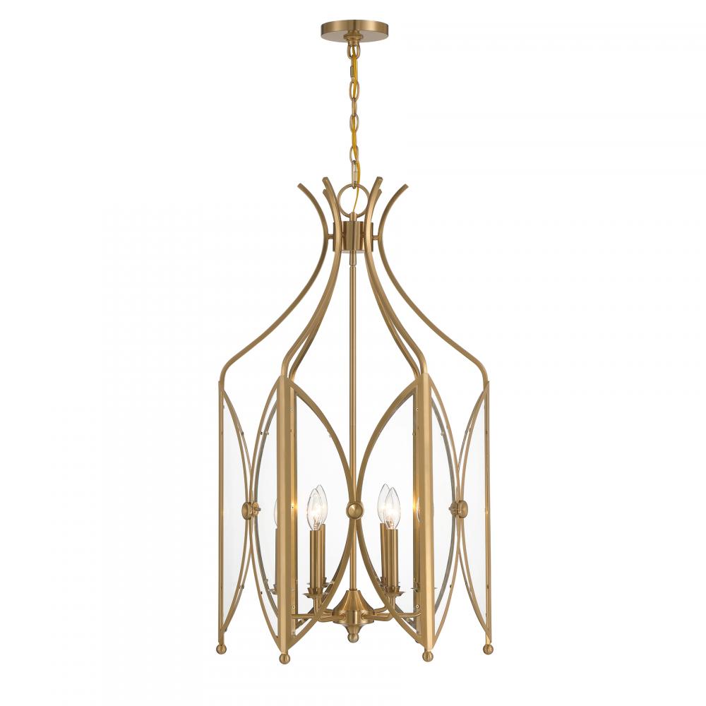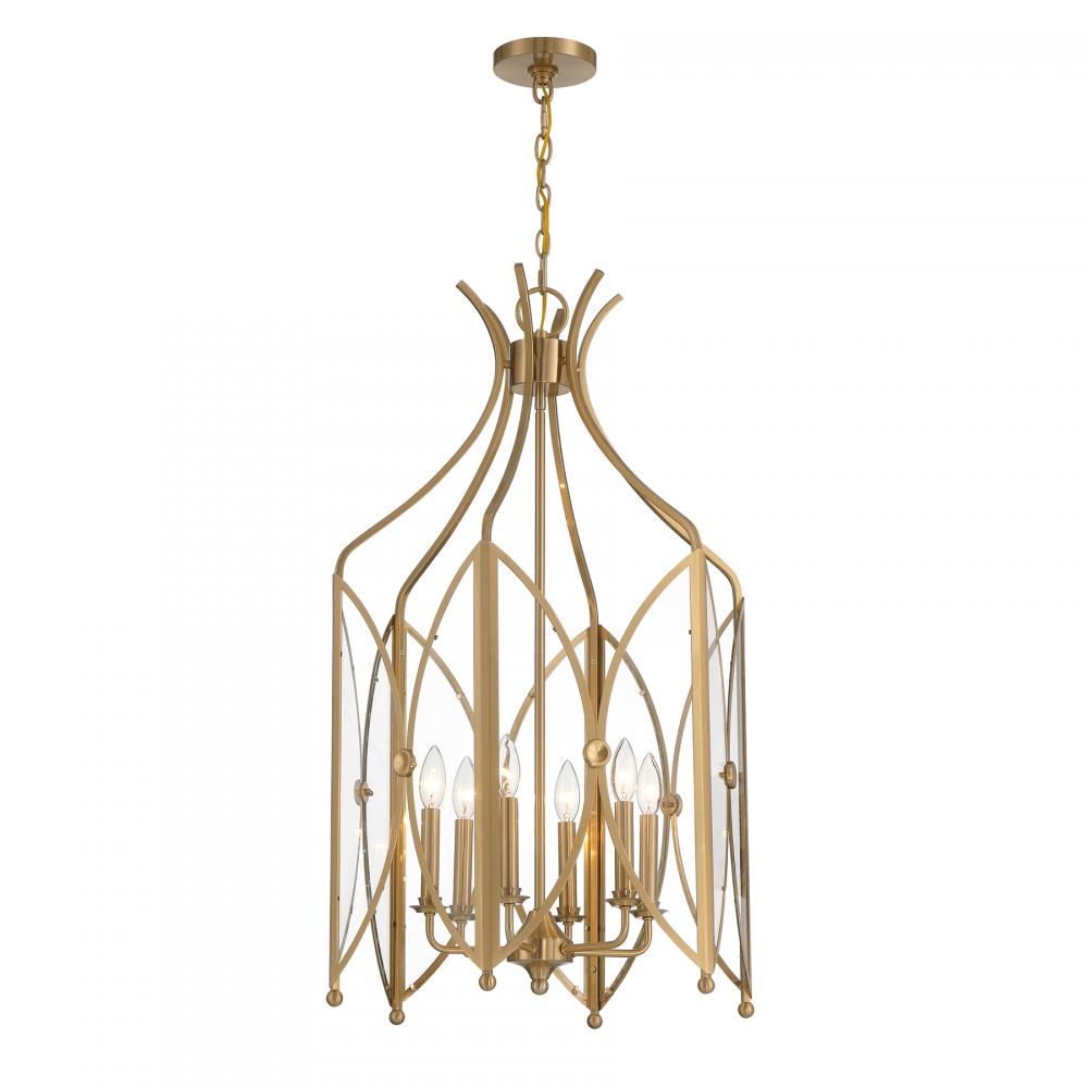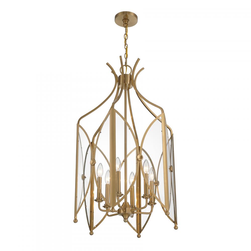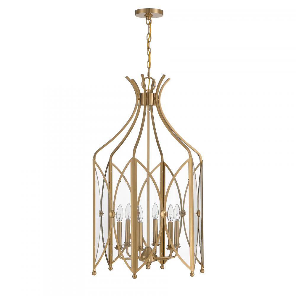 Elegant and dramatic, the Savoy House Enclave 6-light lantern offers a strikingly beautiful lighting look. It is decorated with panes of clear glass in curving frames that recall the look of leaves and seem to multiply the lights within. The Noble Brass finish adds a bold touch of luxury. Enclave is 35" in height and 21" in width. It uses six candelabra size bulbs of up to 60 watts per bulb. Bulbs not included.
