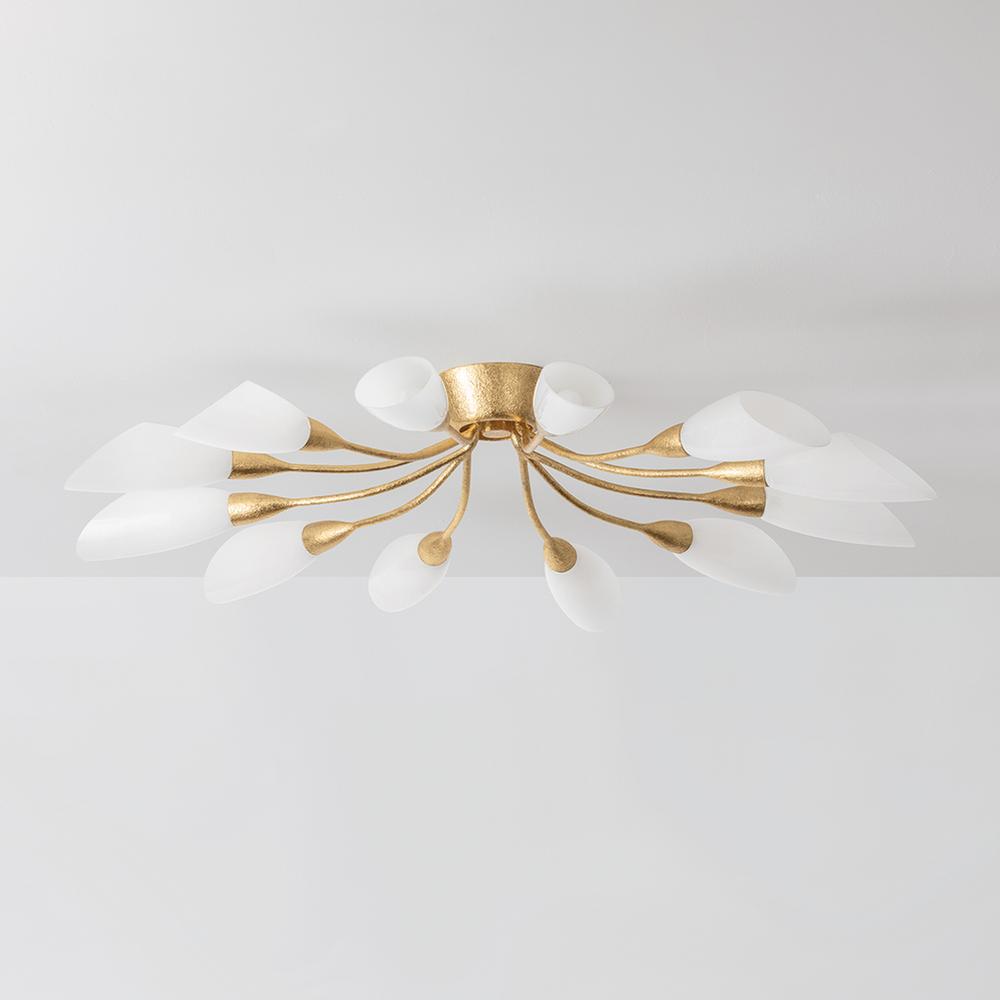 The botanical silhouette of Enfield features a sleek branching profile in scaled-up proportions. Cloud glass shades inspired by floral blooms offer a soft, contemporary feel with bias-cut ends that direct light upwards. The elongated, slender ‘stems’ embody a modern aesthetic, enhanced by the luxurious Vintage Gold Leaf finish.