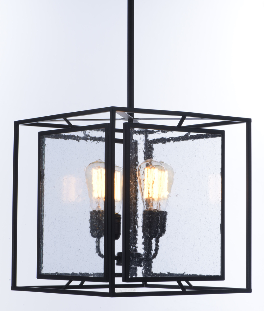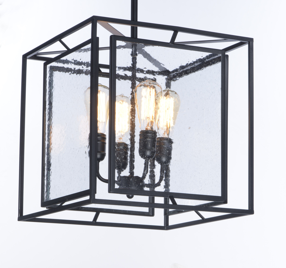 Geometric metal frames finished in Black support panes of clear Seedy glass, provides for a refined restoration look. Add vintage bulbs (not included) to complete the authentic feel of this design.