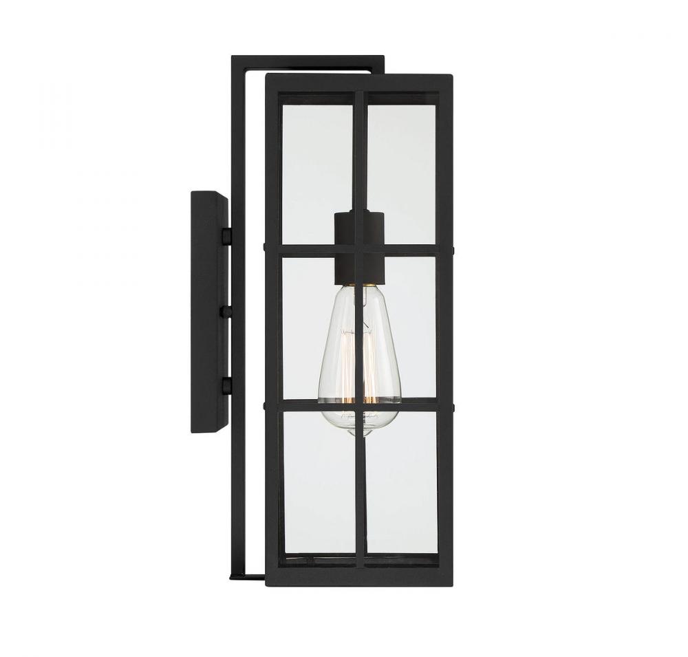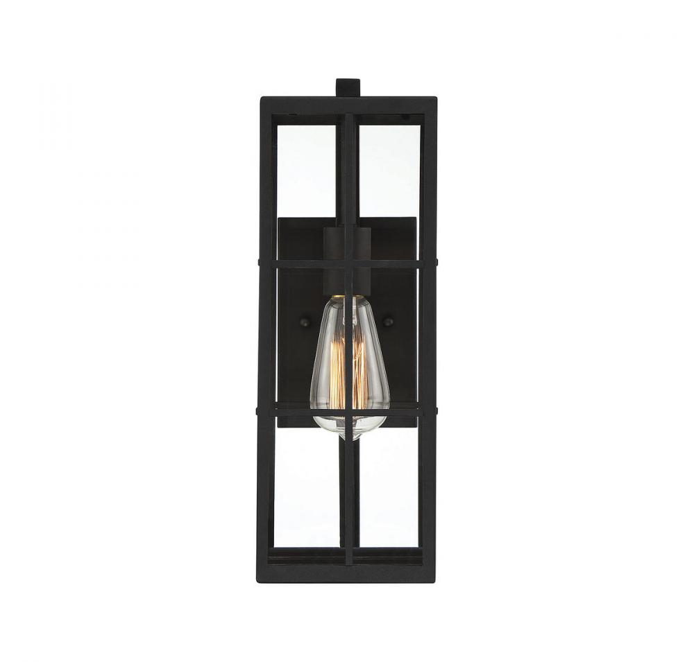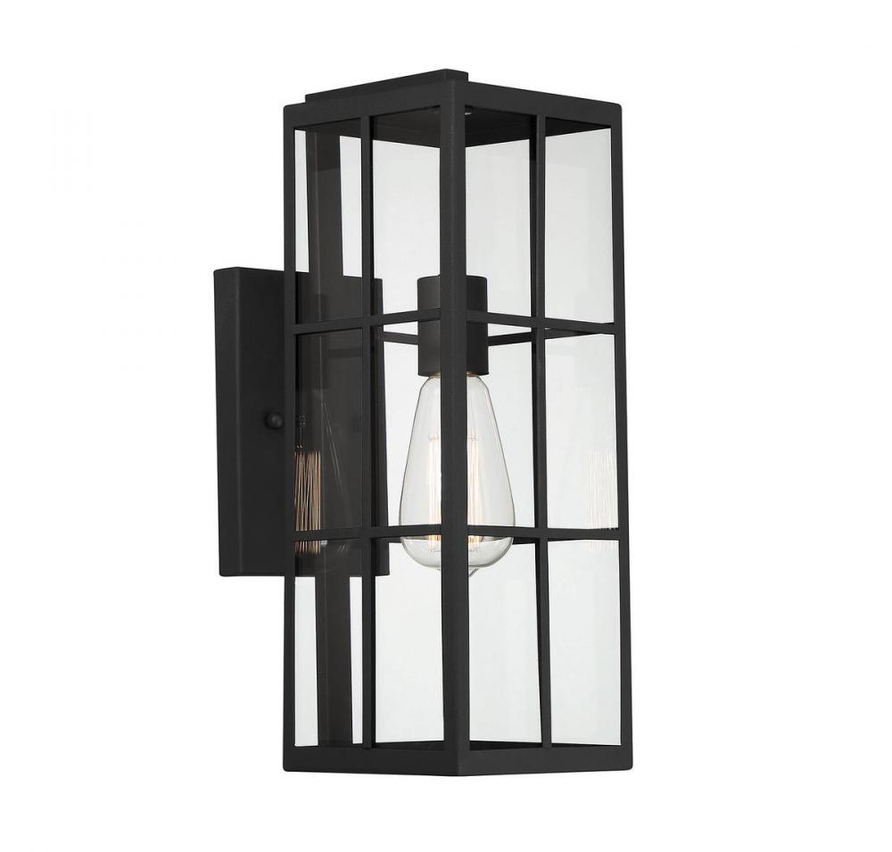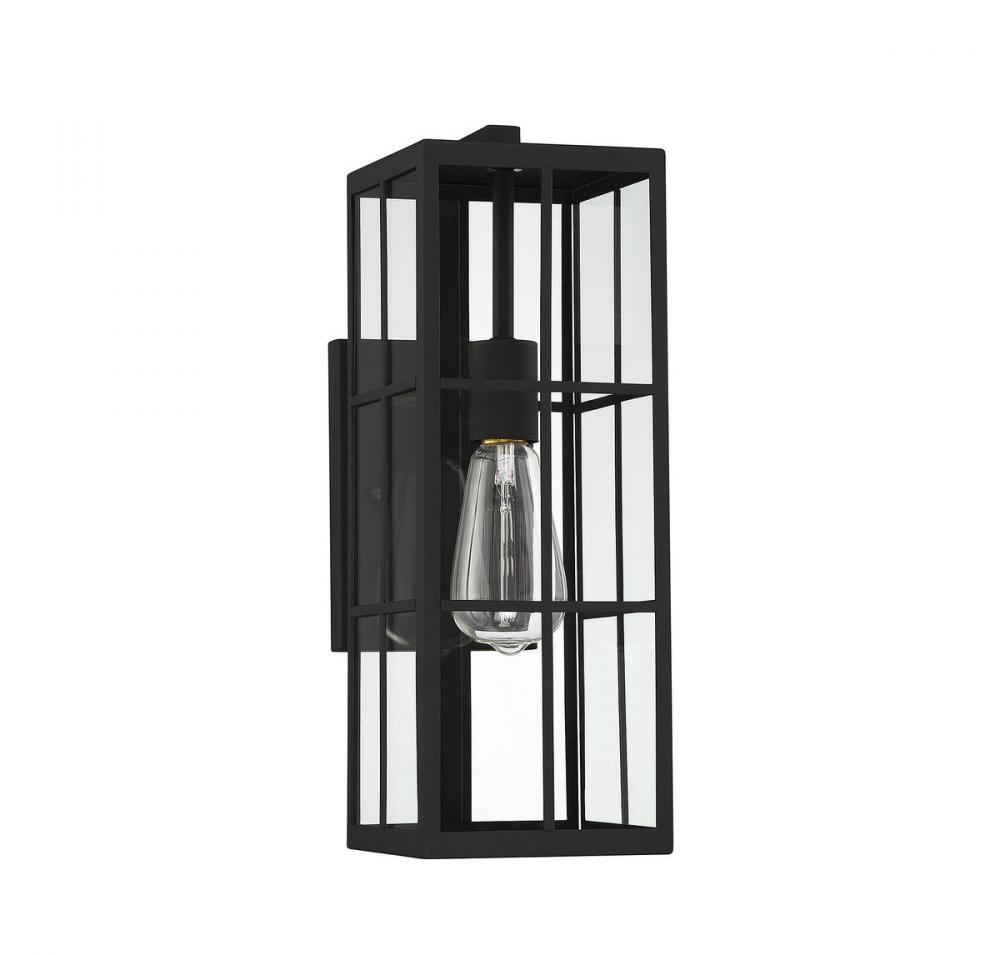 This Savoy House Ericson 1-light outdoor wall lantern features an intriguing look that is reminiscent of fashion-forward black paned windows. Whether Ericson is used solo or in groups, it is sure to create a beautiful first impression outside any home. Matte black finish with clear glass. Ericson is 16" in height, 5.5" in width and extends 8.25" from the wall. It uses one standard size bulb of up to 60 watts. Wet area rated.